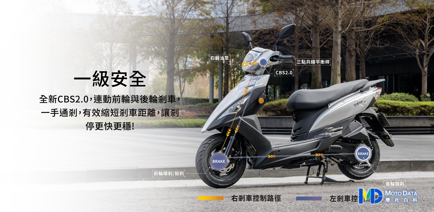 圖:迪爵125搭載全新CBS2.0剎車系統,連動前輪與後輪剎車,一手通剎,有效縮短剎車距離