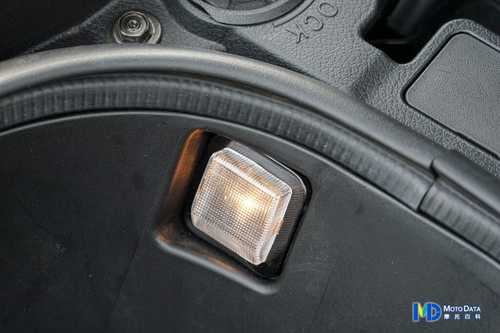 以大型休旅速可達來說,TTLBT 配備的坐墊高度為 780mm 並不會太高,因為車身的寬度關係,實際乘坐時騎士的臀部要往前移動一點才會比較容易踏到地面,前座後方的靠墊可以進行三段位置調整,需要透過工具從坐墊下方進行,後座本身坐墊則是偏硬朗些,很多人會覺得軟才是舒適,但軟的舒適僅限騎乘前 30 分鐘,長途時就會發現過軟的座椅並不舒適,反而好的支撐性能帶來更好的長途舒適性,打開坐墊後 26 公升的置物箱,可放入一頂全罩式安全帽,Rick 我平常戴的 SHOEI Z-8 XXL 帽體也能輕鬆吞下,坐墊採用連桿與油壓桿支撐,坐墊不會意外蓋上,油壓桿前方還有 OBD 車輛檢測端子,坐墊內兩側還有用於固定側箱的鎖定機構,坐墊下方還有用於夾文件的夾具等,較為可惜的是全車都用 LED 燈具,卻在車箱燈用上鹵素燈泡,不過至少有預留,日後要改換 LED 燈泡來省電也比較輕鬆。