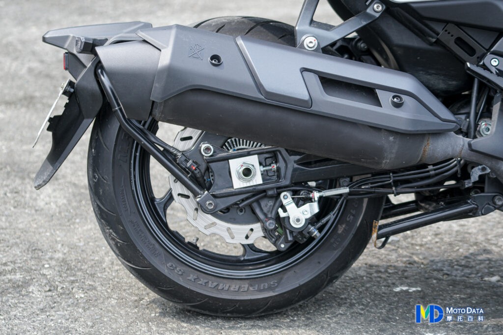後輪制動系統為單向單活塞卡鉗,搭配 275mm 的浪花造型固定式碟盤,除了有 BOSCH 9.3MP ABS 防鎖死煞車系統輔助之外,後輪的卡鉗也有機械式手煞車結構,把側柱踢出之後,連動鋼索拉動卡鉗上的機械手煞車結構,將活塞推出並利用槓桿力矩方式固定活塞,除了非常直覺之外,更重要的是此方法可避免因停放時間拉長導致油壓煞車失效的問題,所以廣泛被進口速可達與部分進口雙離合器自手排檔車使用。