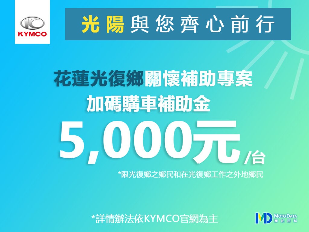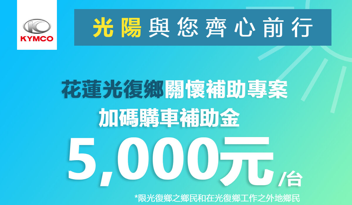 為減輕風災對居民的影響,光陽宣布即日起啟動「花蓮光復鄉關懷重建購車補助專案」針對符合資格之購車民眾,每台車加碼補助 5,000 元,盼望透過此專案註1-4 協助當地居民渡過難關。