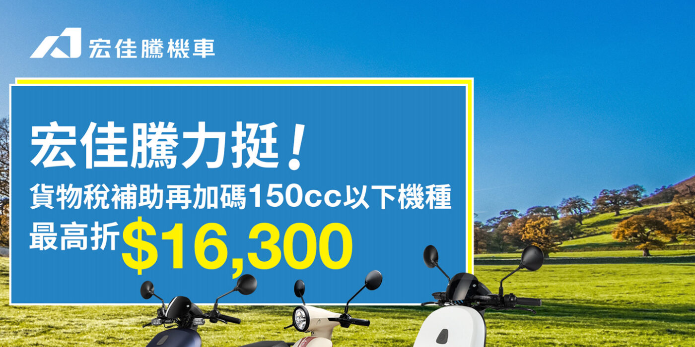 宏佳騰致力以創新技術充實產品陣容,為市場帶來多元交通選擇,豐富現代移動生活。為響應政府貨物稅補助方案加碼,宏佳騰力挺再送購車折扣,旗下150cc以下機種最高折16,300元(含宏佳騰車系加碼、政府汰舊換新補助、貨物稅補助、廢車回收),邀請消費者把握入手心儀座駕的絕佳時機。