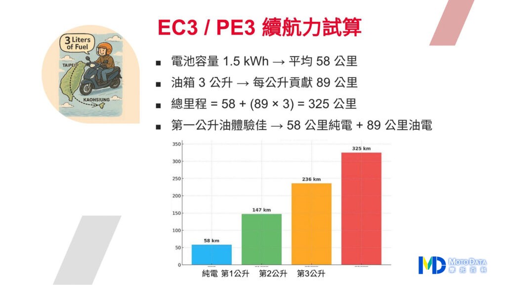 - 增程引擎每公升汽油可轉換 89km 續航力,PE3 有三公升油箱,續航力 267km