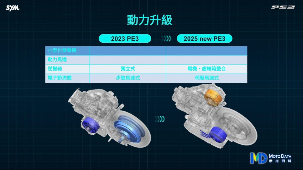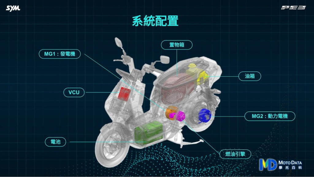 PE3 是三陽旗下首輛使用 48V Z.R.S.G. 系統的車型,來自中油的 48V 軟碳鋰電池放置在腳踏下方,油箱則是在坐墊下車箱後方,這樣就騰出車箱空間,可放入安全帽,圖片中推動 MG1 發電機的燃油引擎是源自 Woo115 的引擎組,MG1 是由士林電機開發的 3.5kW 發電機組,MG2 則是用於動力輸出的 4kW 無刷馬達,由信通交通器材製造,這些調配都是由三陽獨家開發的 VCU 進行控制;另外若有注意到的話,會發現到原本 2023 年展出的 PE3 使用的是輪轂馬達,現在 2025 版本改成使用後置馬達,尺寸一併縮小,控制引擎轉速的電子節流閥也從原本的步進馬達改為伺服馬達,可以更精準控制引擎轉速,降低怠速等,就連 MG1 發電機尺寸都一併縮小。