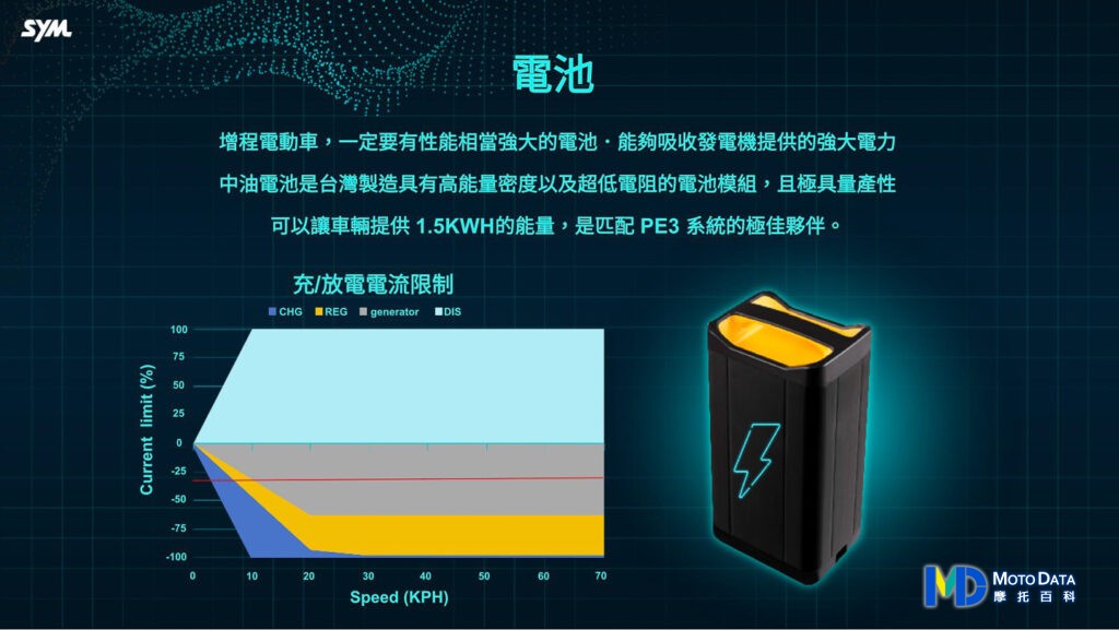 動力切換方面,透過電子節流閥將引擎的轉速調整至最佳發電區間,而且會自動進行引擎的發動與熄火,來讓電池的電壓狀態穩定住,就如同前面所說,PE3 使用的就是中油的交換式電池組,但 PE3 將其固定於車輛腳踏下方,不可交換設計,之所以要使用中油的電池組,是因為中油的軟碳鋰電池結構擁有更快速的充電效率,對應 EREV 這種車型來說,正需要這個特性,才能讓車輛電力保持充放狀態,1.5kWh 的容量,輸出電壓為 48V,算是通用性很高的設定,另外動力補充還能夠過 CNS16127 : 2020 的小型 TES 充電埠連接,也就是說以後去加油站加完油,還可以去使用中油的快速充電站,讓車輛達到真正的雙能源 100%,續航力超過 300km。