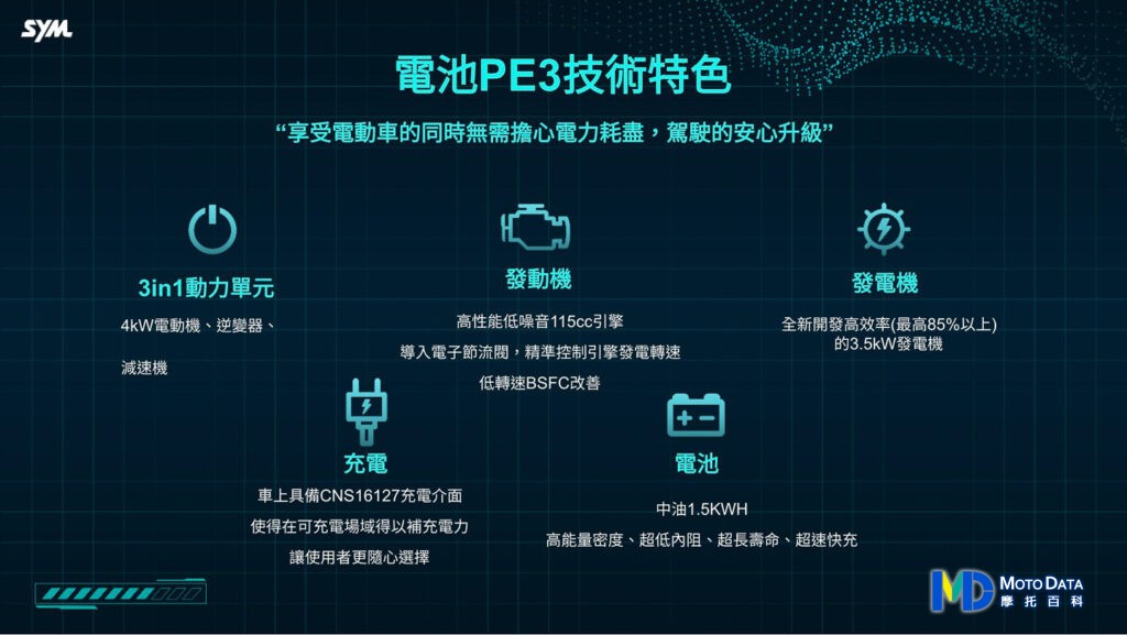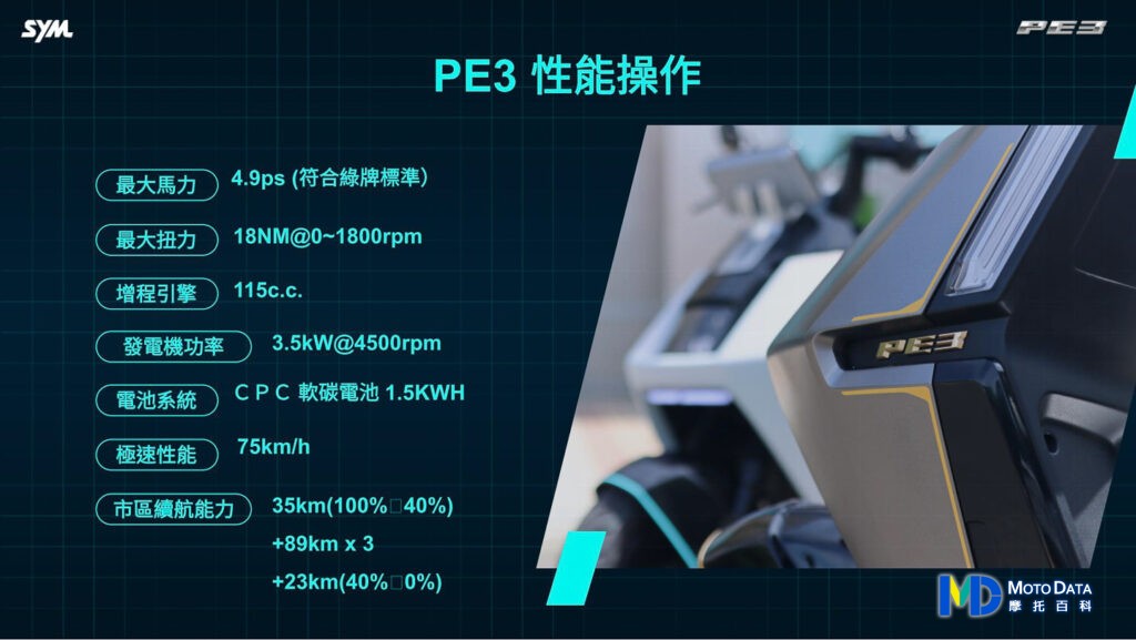 首先 SYM 這次推出的車型 EREV 指的是 Extended Range Electric Vehicle,也就是增程型電動車輛,透過車輛搭載內燃機引擎,並讓內燃機引擎作為發電機,這樣只要有汽油,就能讓續航里程持續增加,因此可以有效降低電動車常見的里程焦慮,同時也能降低換電站的依賴,三陽更表示目前換電站的這種方式,一年就要燒掉一億,幾乎不可能回本之外,也是一種資源浪費,所以三陽才會想要推廣 EREV 這種車型;三陽這次 PE3 的概念車型設計上是以綠牌級距為主,採用 Woo115 的內燃機引擎,搭配中油的電池系統,車輛前進的推力完全來自於電池與馬達,引擎不參與動力輸出的環節,僅提供電力給電池充電與馬達放電使用,既然提到中油,PE3 的增程方式不僅有內燃機,同時還有插電式充電,未來中油也會佈設相關充電站,讓 PE3 等車型能做快充使用,里程方面,PE3 透過電池 可行駛 58km + 油箱容量三公升,每公升可發電行駛 89km 的燃油發電總合後,車輛車上的能源完全用完可行駛達 325km 的總里程,非常驚人。