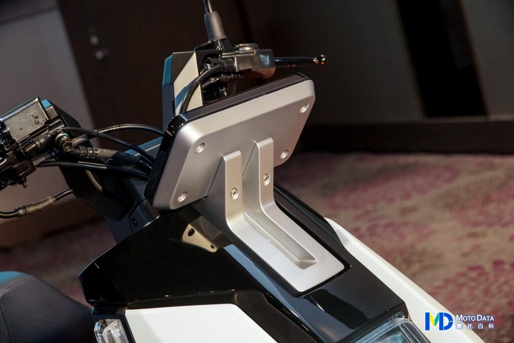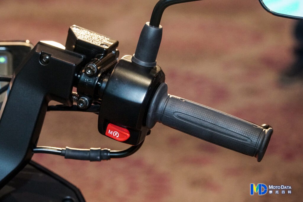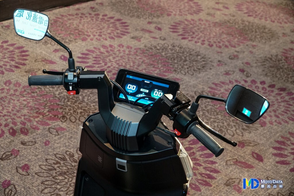 騎乘視角可以看到一樣具有科技感的把手樣式,中央儀錶板是五吋的 TFT 全彩液晶,顯示則是有時速、電量輸出、電量數值與燃油/電池可行駛里程預估,把手開關跟 E-Woo 相似,都是簡單的開關組,沒有複雜的切換開關。