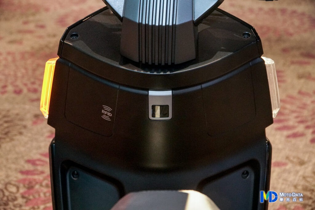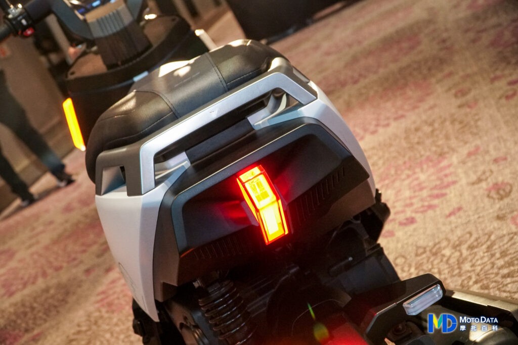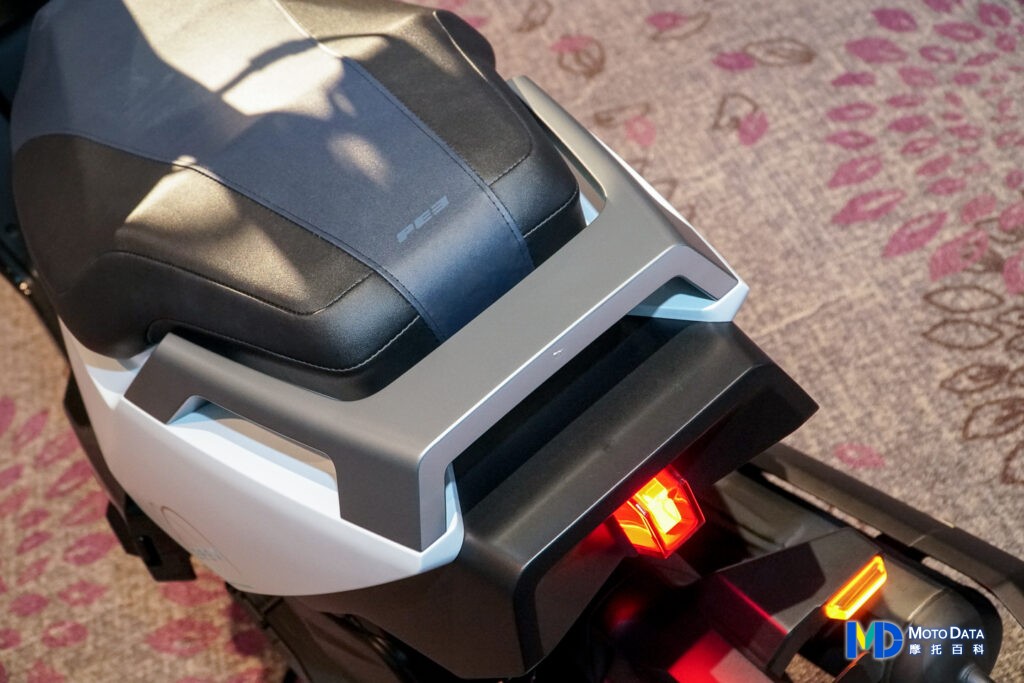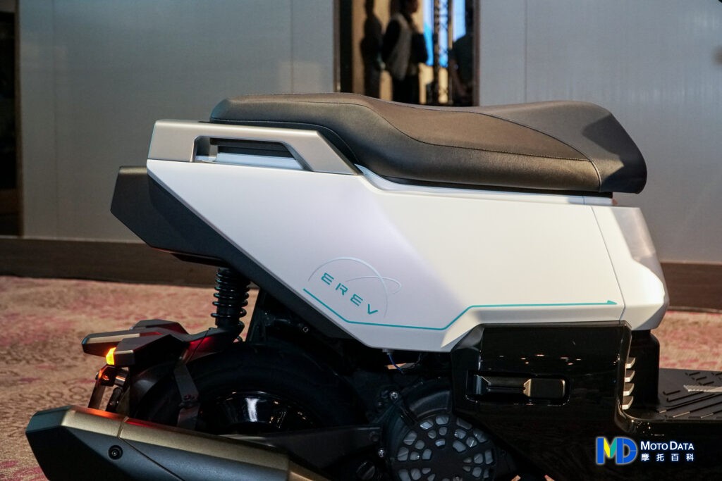 車身線條一樣是帶有科技感的風格,後端直接寫明 EREV 的標誌,坐墊高度粗估約在 780mm 上下,坐墊下方可放入一頂 3/4 安全帽之外,後方還有三公升的油箱,用於推動 MG1 發電機的內燃機引擎使用,坐墊尾端還可以看到 PE3 的字樣。