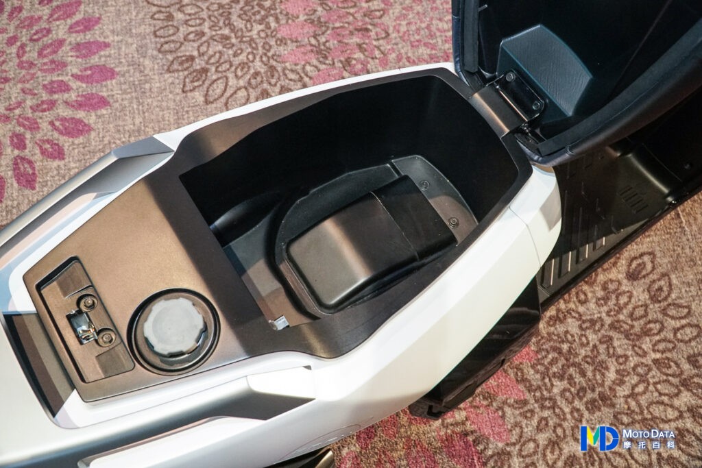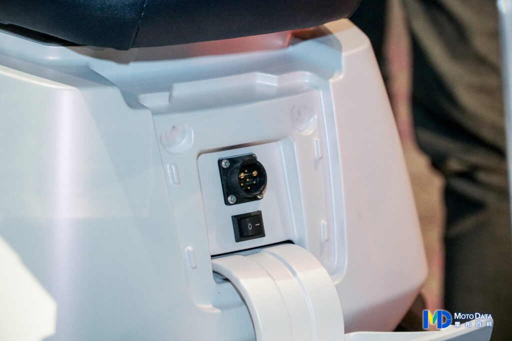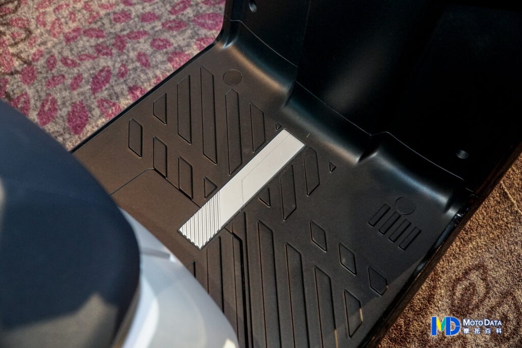 內裝空間看起來目前暫無至物杯架,但有看到 RFID 感應區域,可能採用感應卡片啟用車輛,下方腳踏踩踏區為平踏設計,無斜踏區域,內部是中油的軟碳鋰電池組,雖然看起來腳踏的厚度因為有電池導致非常厚,可是其實騎乘時並不會被這個腳踏高度影響到,舒適性還是有的;腳踏後方坐墊下方有一組飾蓋,打開後可以看到 CNS16127 : 2020 的小型 TES 充電埠,可用於在充電站內替 PE3 內的電池充電使用。