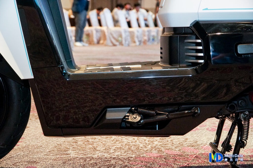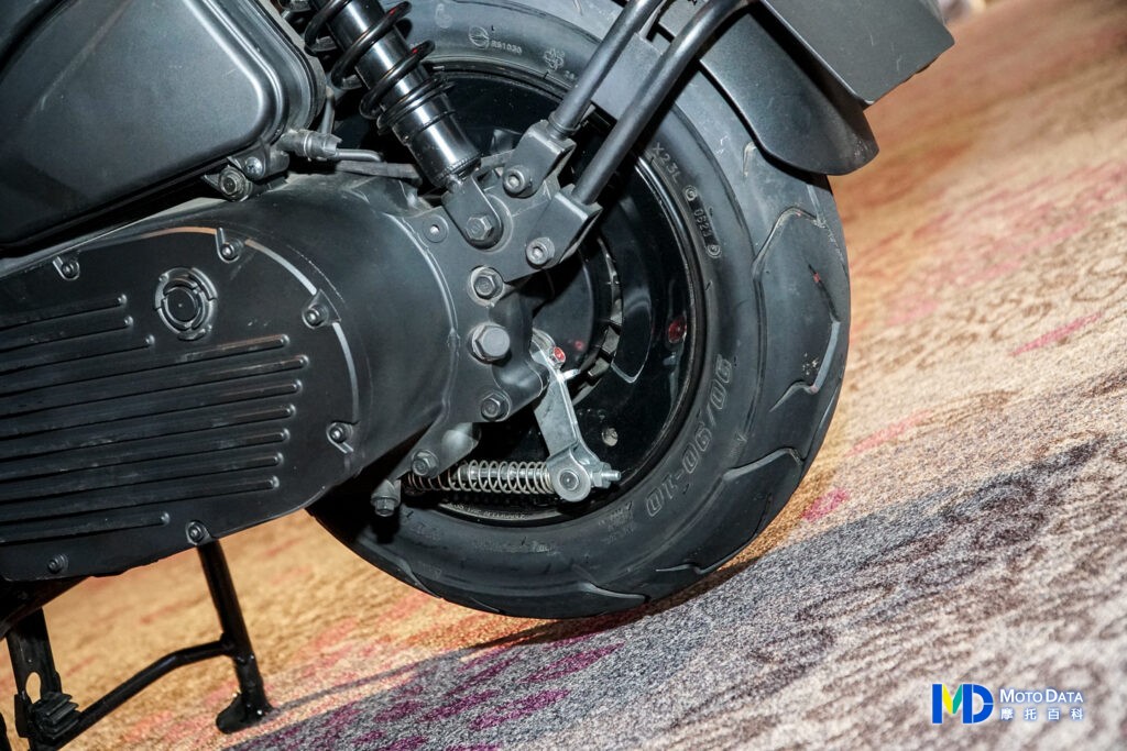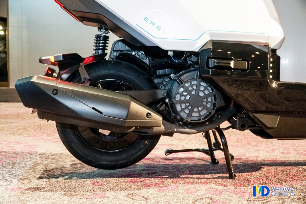 後輪制動系統目前暫定為鼓煞組,可提供車輛足夠的制動效果,因為是屬於 EREV 增程式電動車,所以在右側可以看到排氣管,在透過內燃機充電時,的確會產生廢氣,因此原廠目前設定是無法拔除鑰匙後持續發動引擎幫電池充電。