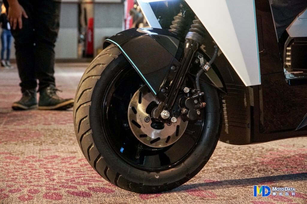 目前 PE3 為概念工程驗證車,所以整體的車輛規格配備並非最終樣式,目前在這輛工程車上採用的前輪懸吊一樣是正立潛望式前叉,搭配 12 吋輪圈,制動系統則是使用碟煞,搭配單向雙活塞卡鉗,輪框則特別用飾蓋遮住,除了讓輪框看起來更美觀更有科技感外,同時也能降低一點風阻,達到節能效果。