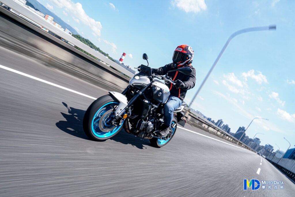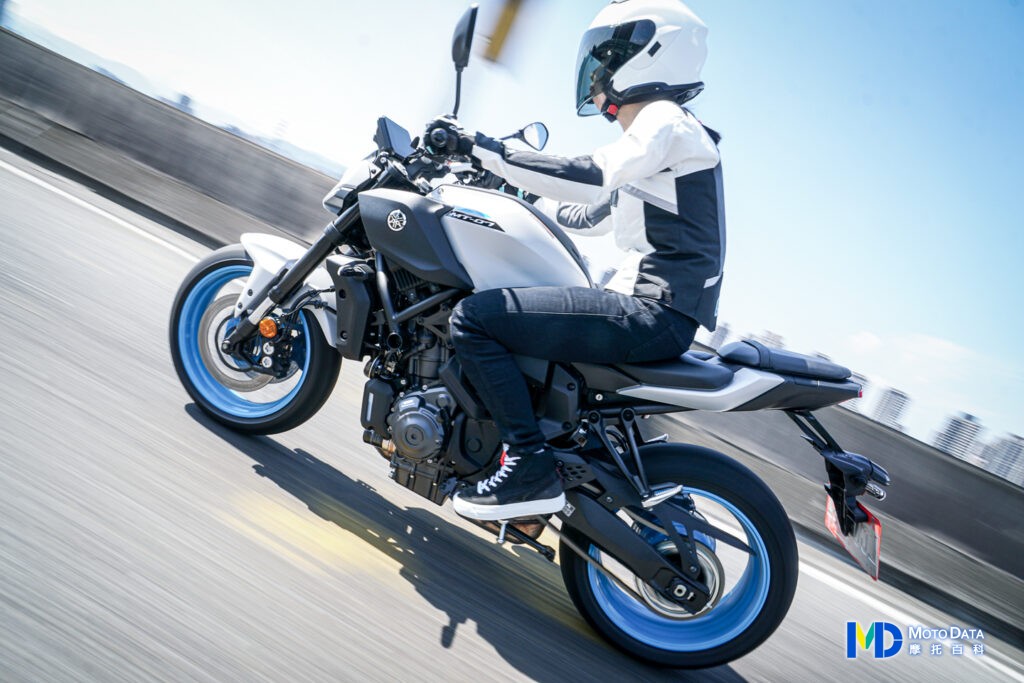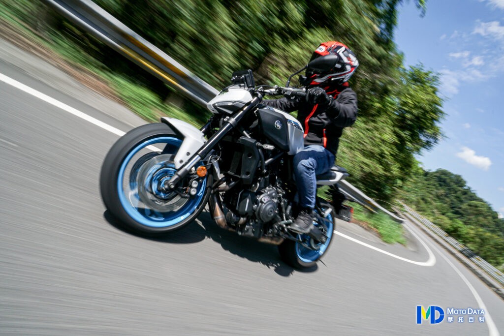 車體的改變則是讓這次新的四代 MT-07 騎起來感受更輕盈,以前的 MT-07 騎起來總是覺得車體回應上,的確有所謂的重機感,但更多感受是舊款 MT-07 帶來比較沒那麼靈活的操控表現,這次四代 MT-07 則是透過前傾角與拖曳距的改變,以及把手位置的調整,還有車台調整以及鎖固螺絲位置的變更等,MT-07 騎起來比競爭對手車型來得更靈活,迴旋性也更好,過起彎來輕鬆寫意,很像是騎士肢體的延伸,對於騎乘的感受回應也更直接且快速。