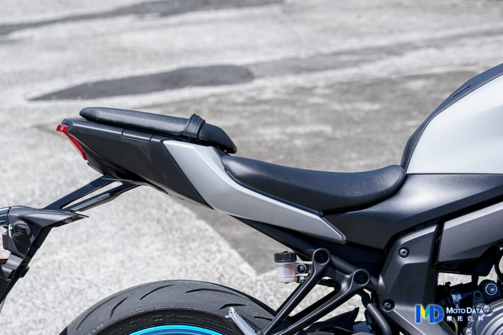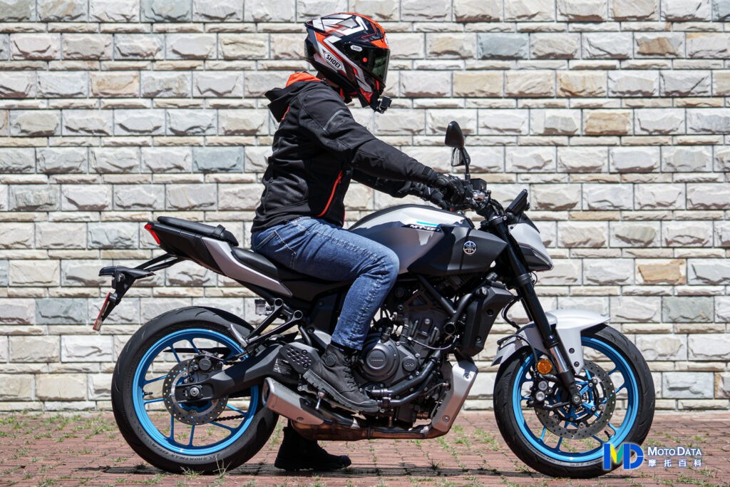 身高比例圖部分,上圖中騎乘 2025 MT-07 的男性騎士是資深試車手 TK,身高為 173cm,體重 70kg;儘管坐墊高度設定在 805mm 的座高數據,不過因為 MT-07 本身就是使用並列雙汽缸的引擎車款,加上新的車台設計,將坐墊前端的寬度削窄整整 25mm,並調整了油箱的造型,讓第四代 MT-07 的足著性非常好,單腳著地平踏不成問題,雙腳也僅需要墊一點腳就行,上半身姿態也因把手向後 9.3mm 以及降低 22mm 的調整,還有兩邊各增寬 9mm,整體運動騎乘感受更強。