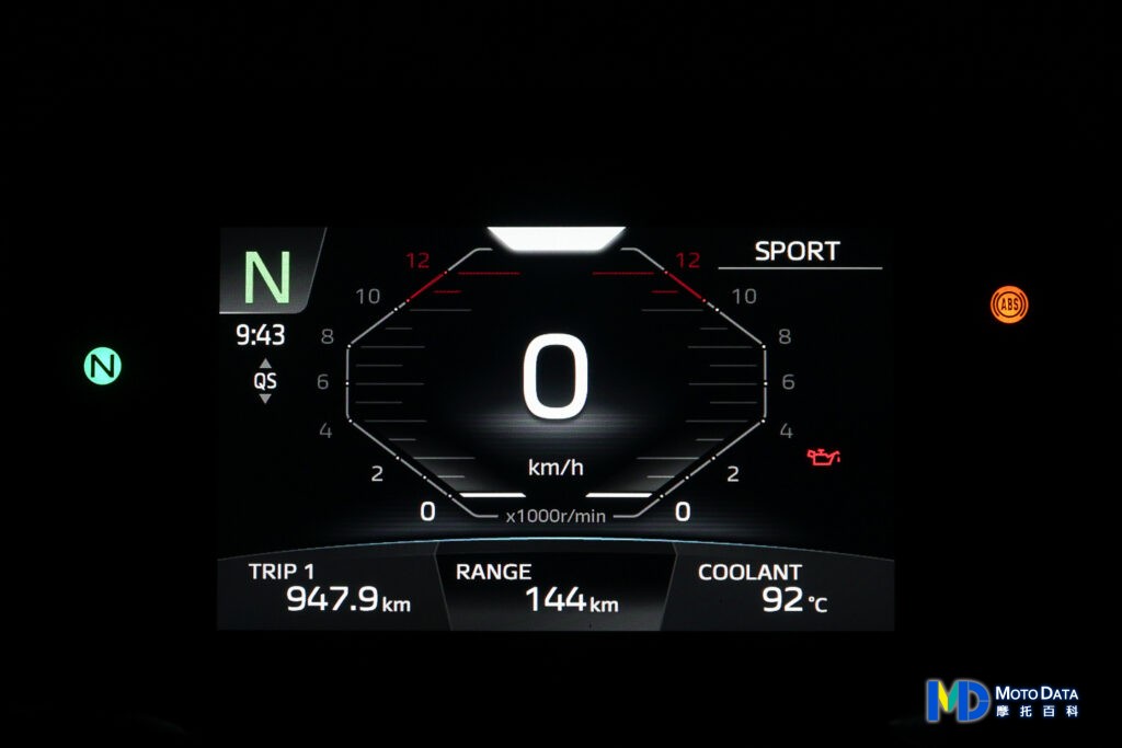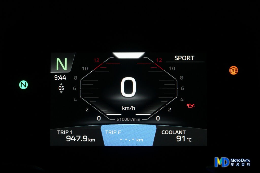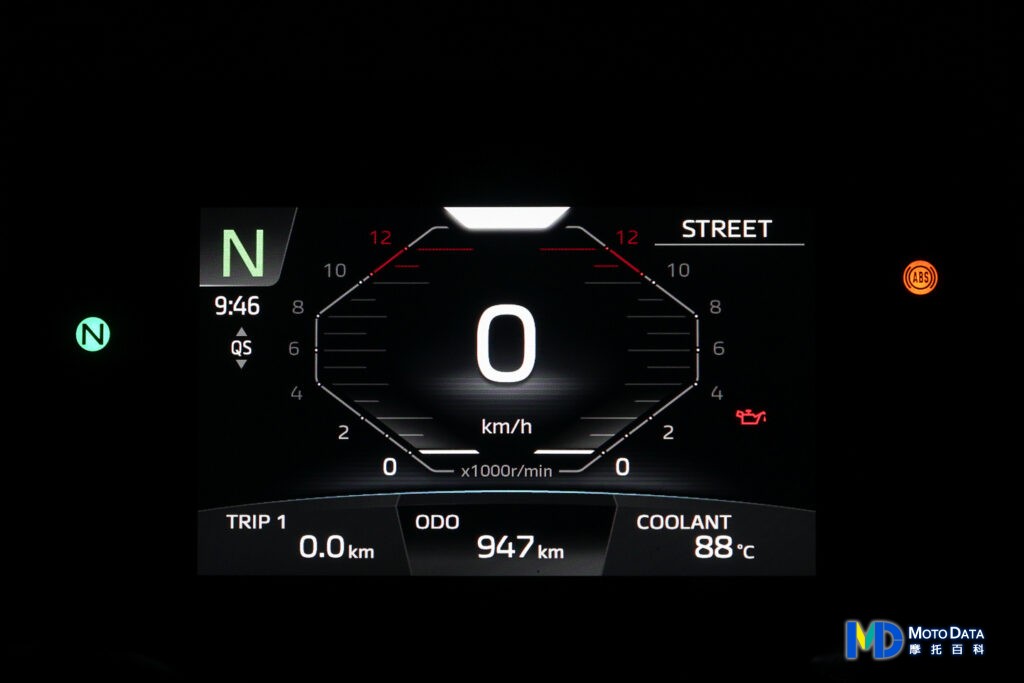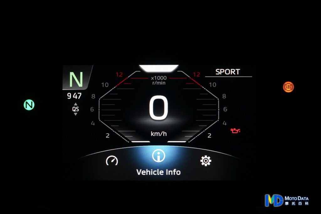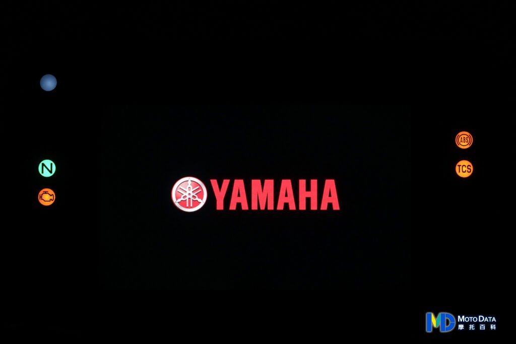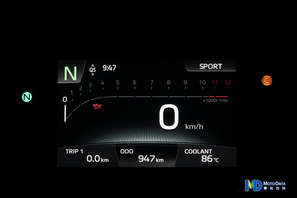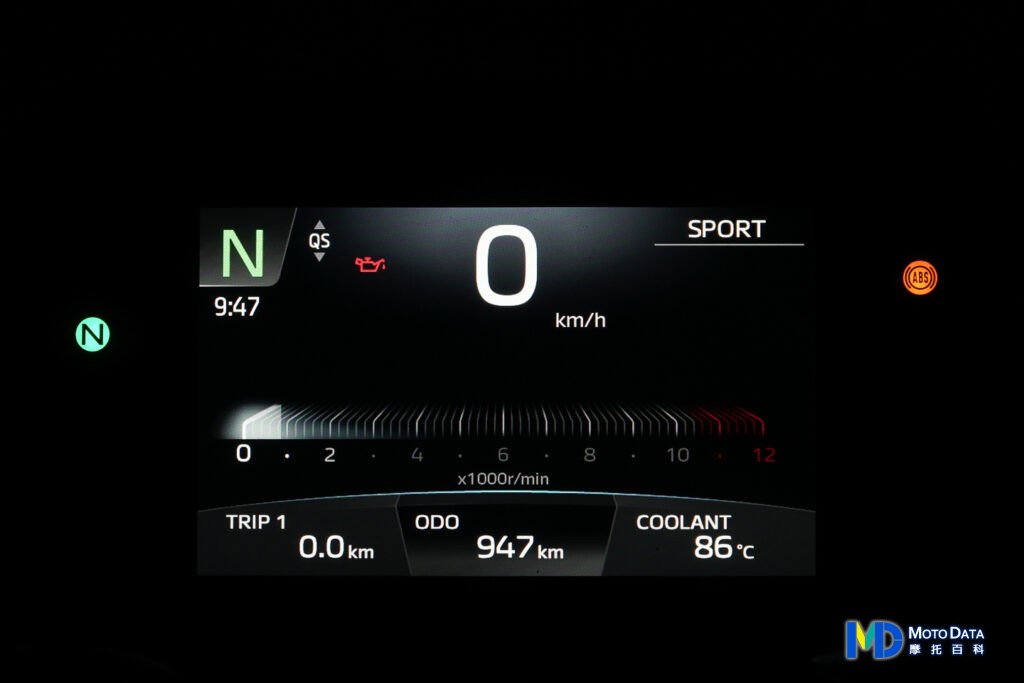 五吋全彩液晶儀表板在啟動時會顯示 YAMAHA 標誌,偶爾有機會觸發隱藏的 MT 標誌啟動動畫,開啟後主介面以大面積時速與兩旁轉速搭配,主題可做四種模式切換,每種主題還有日夜間的對比顯示差異,下方的里程資訊則是可在總里程、單趟里程 1 / 2、殘油里程、即時油耗、平均油耗、可行駛里程、冷卻水溫度、氣溫溫度與里程時間間切換,想要的話可以把三個都切成同一個,儀錶板並沒有限制左中右區域可擺放的項目,這點真的要給予好評,並且因為這台是乘車輛已經安裝進退快排系統,所以在檔位顯示的下方可以看到 QS 字樣,至於 QS 字樣的上下方箭頭,則是系統允許該方向的換檔時會改為綠色箭頭,例如在一檔時會只亮起上方的綠色箭頭,僅允許使用快排進檔,而若是在三檔巡航狀態,上下方的綠色箭頭都會亮起,這代表電腦允許使用快排進檔或退檔都可以,非常直覺。