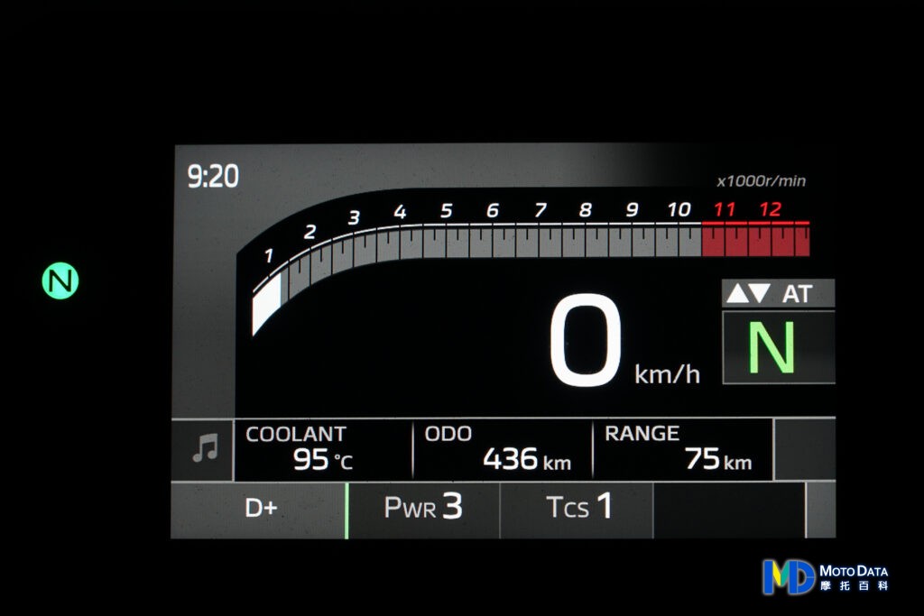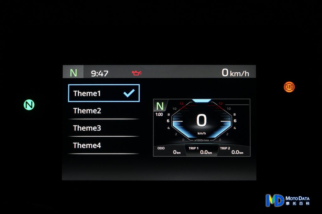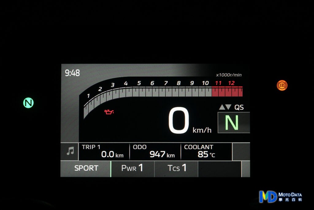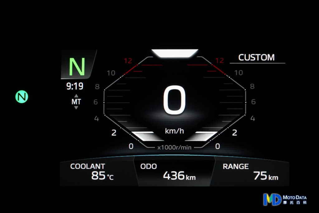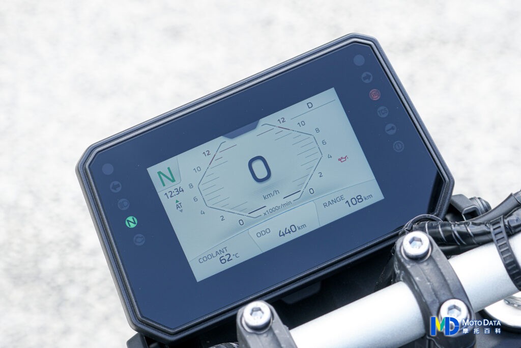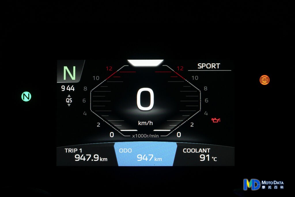 五吋全彩液晶儀表板在啟動時會顯示 YAMAHA 標誌,偶爾有機會觸發隱藏的 MT 標誌啟動動畫,開啟後主介面以大面積時速與兩旁轉速搭配,主題可做四種模式切換,每種主題還有日夜間的對比顯示差異,下方的里程資訊則是可在總里程、單趟里程 1 / 2、殘油里程、即時油耗、平均油耗、可行駛里程、冷卻水溫度、氣溫溫度與里程時間間切換,想要的話可以把三個都切成同一個,儀錶板並沒有限制左中右區域可擺放的項目,這點真的要給予好評,並且因為這台是乘車輛已經安裝進退快排系統,所以在檔位顯示的下方可以看到 QS 字樣,至於 QS 字樣的上下方箭頭,則是系統允許該方向的換檔時會改為綠色箭頭,例如在一檔時會只亮起上方的綠色箭頭,僅允許使用快排進檔,而若是在三檔巡航狀態,上下方的綠色箭頭都會亮起,這代表電腦允許使用快排進檔或退檔都可以,非常直覺。