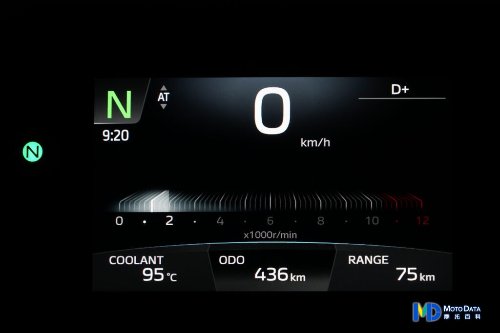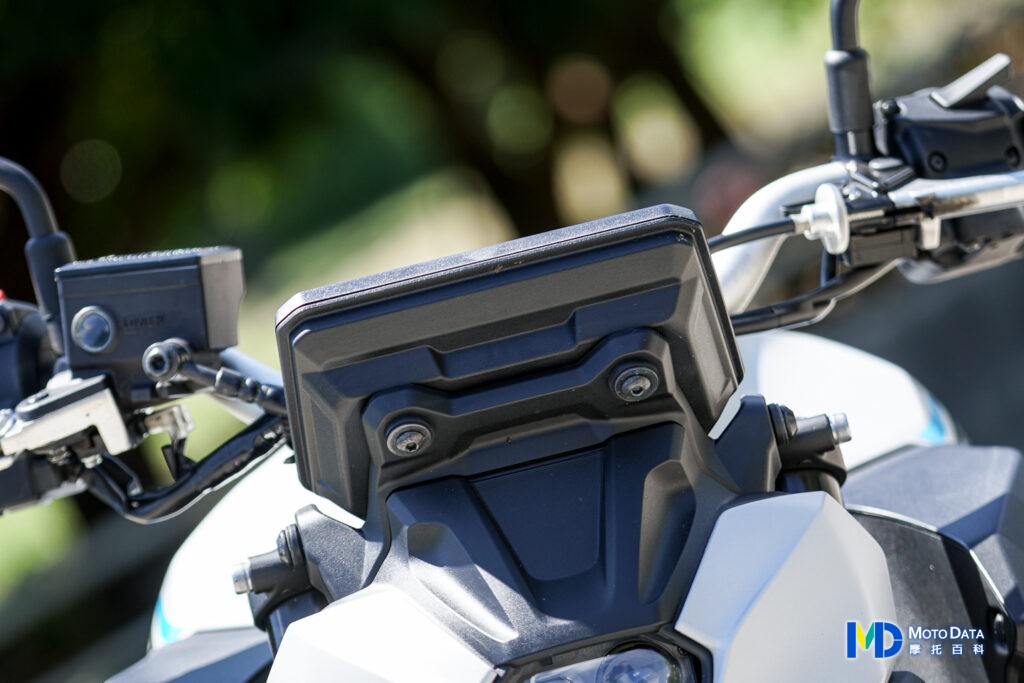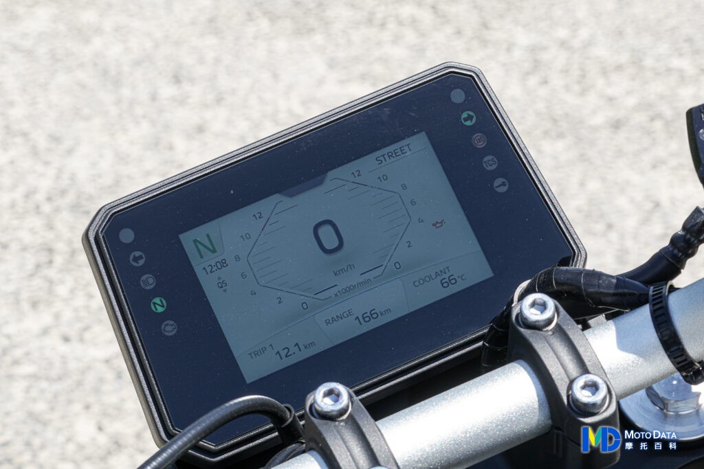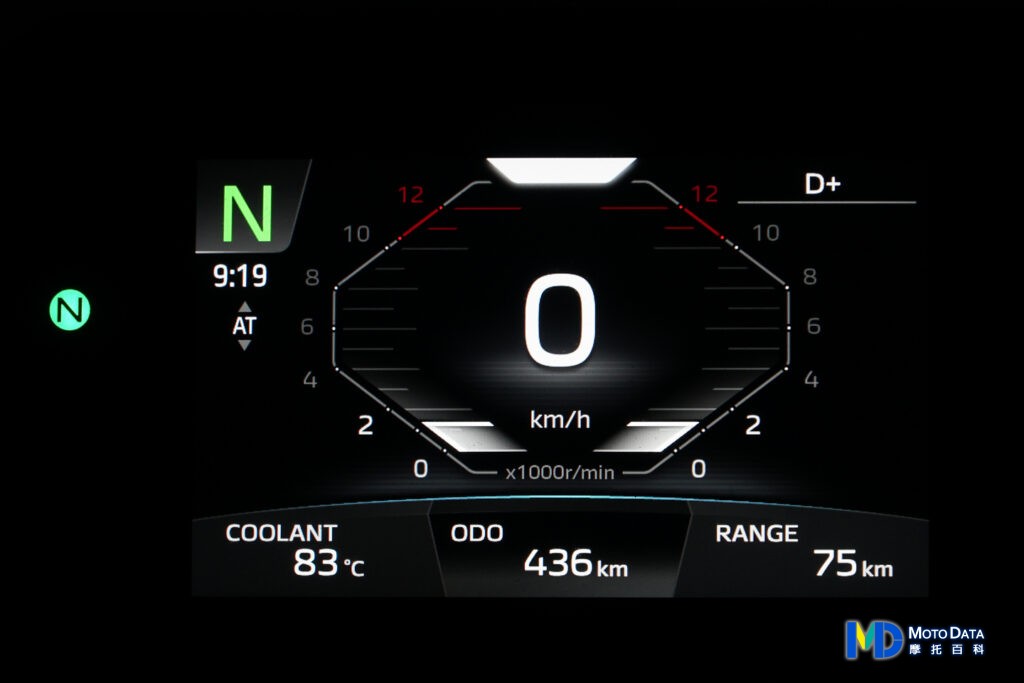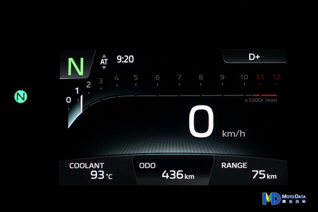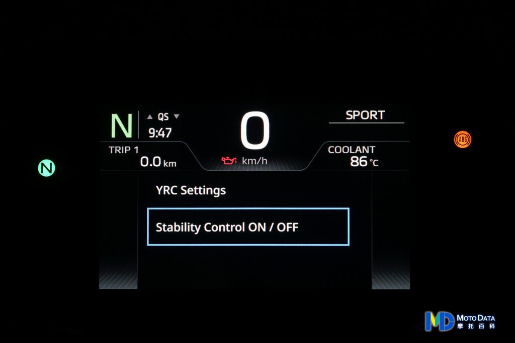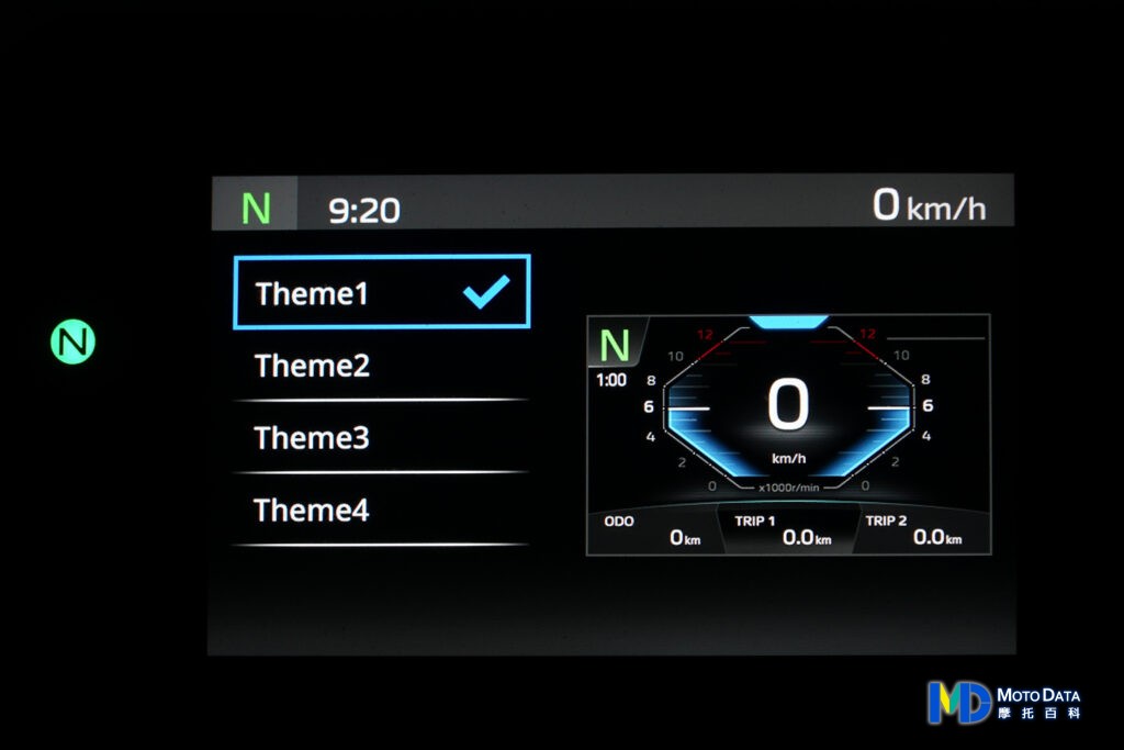 五吋全彩液晶儀表板在啟動時會顯示 YAMAHA 標誌,偶爾有機會觸發隱藏的 MT 標誌啟動動畫,開啟後主介面以大面積時速與兩旁轉速搭配,主題可做四種模式切換,每種主題還有日夜間的對比顯示差異,下方的里程資訊則是可在總里程、單趟里程 1 / 2、殘油里程、即時油耗、平均油耗、可行駛里程、冷卻水溫度、氣溫溫度與里程時間間切換,想要的話可以把三個都切成同一個,儀錶板並沒有限制左中右區域可擺放的項目,這點真的要給予好評,並且因為這台是乘車輛已經安裝進退快排系統,所以在檔位顯示的下方可以看到 QS 字樣,至於 QS 字樣的上下方箭頭,則是系統允許該方向的換檔時會改為綠色箭頭,例如在一檔時會只亮起上方的綠色箭頭,僅允許使用快排進檔,而若是在三檔巡航狀態,上下方的綠色箭頭都會亮起,這代表電腦允許使用快排進檔或退檔都可以,非常直覺。