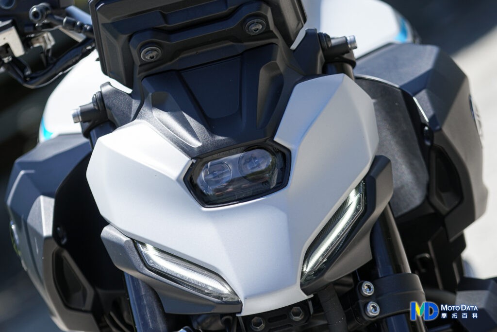 2025 年款 MT-07 外型來說,不僅有著更銳利的車頭樣貌,加上前叉的升級之後,整個車頭看起來運動感更強烈,並且也改變了過往三代的設計,像是大燈組就從單體大燈、單透鏡大燈改為左右小型透鏡燈具搭配面罩的車頭燈組,上方儀錶板也有改變,我要說的並不是儀錶板改成液晶儀錶板這項設定,而是過往三代 MT-07 都有一個非常有趣的細節,那就是鑰匙的位置是在儀錶板前方、大燈上方,直到這次第四代 MT-07 終於大燈上方是儀錶板,鑰匙則改到油箱前方,看起來雖然沒有這麼特別,不過我個人是覺得順眼不少,兩旁方向燈與定位燈均為 LED 燈款式,2025 也是一款主燈具均為 LED 的車款,只有牌照燈並非 LED 燈具。