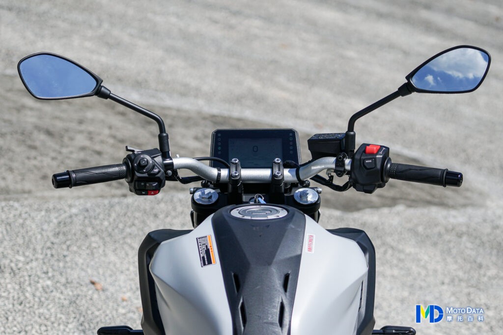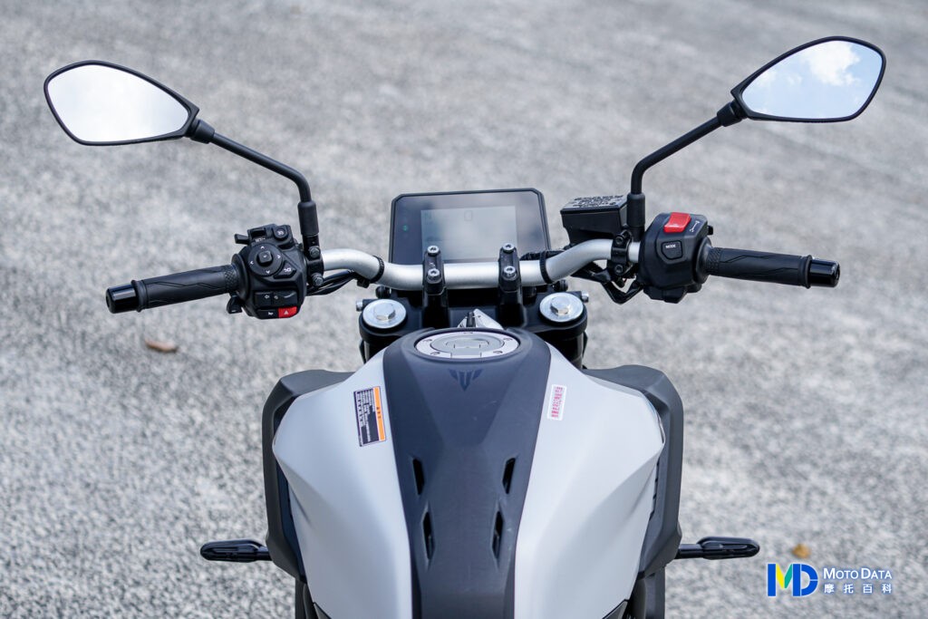 騎乘視角方面,這次 MT-07 的把手寬度一邊提升 9mm,視覺上其實就差不多半個平衡端子寬而已,但其實對於整體的抓握表現來說,把手的改變是有助於提升騎乘舒適度,中央改使用全新五吋全彩 TFT 液晶儀錶板,新的五吋全彩儀錶板不僅支援多種資訊顯示,更重要的是還支援 YRC 騎乘模式的調整,以及手機連線功能去設定 YRC 的數據,還有 GARMIN StreetCross 投影顯示地圖的導航機能,另外還能調整音樂播放等等,左把手則是對應儀錶板的改動,升級成方向搖桿 + 返回鍵去搭配控制,燈型則是整合在上方的扳機式開關,下方方向燈開關也升級為新的單鍵觸發型,短按能像汽車一樣只閃三下就自動關閉,按住則是會保持閃爍,直到移動超過 150 公尺、超過 15 秒自動關閉方向燈,或者手動再按一下關閉,右邊把手則是可以看到 YCC-T 的電子油門與引擎運轉/熄火與電啟動整合開關、騎乘模式切換鍵。