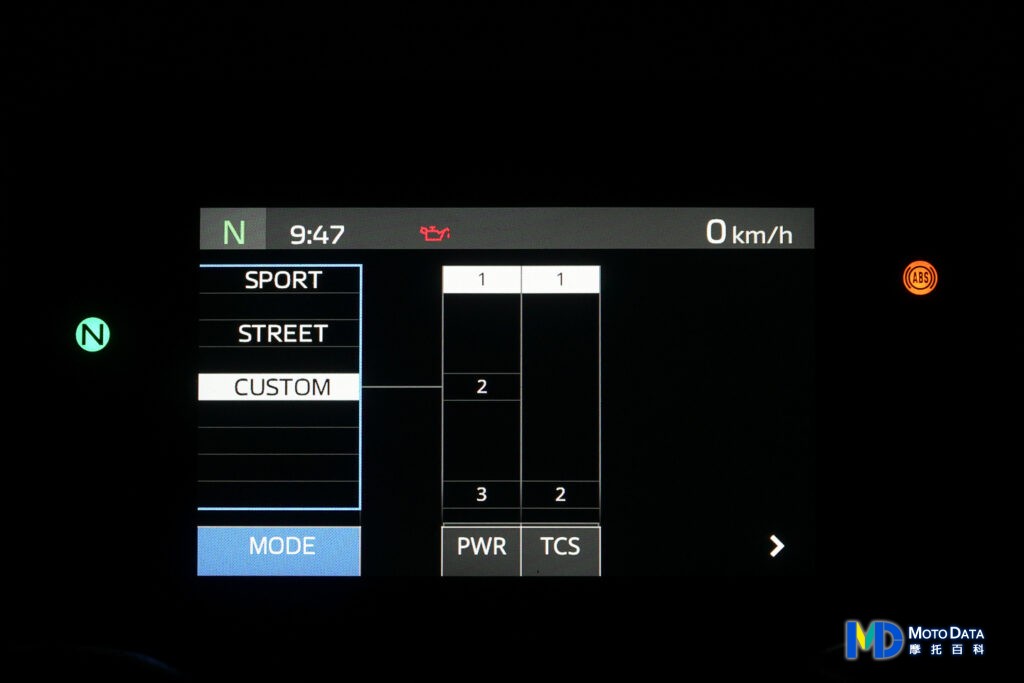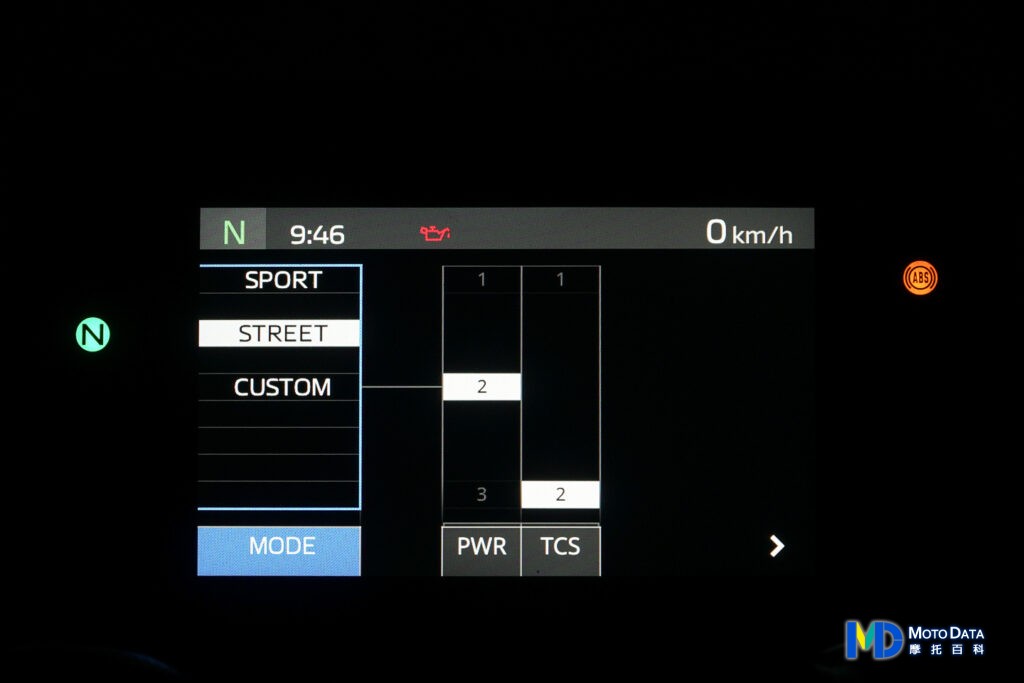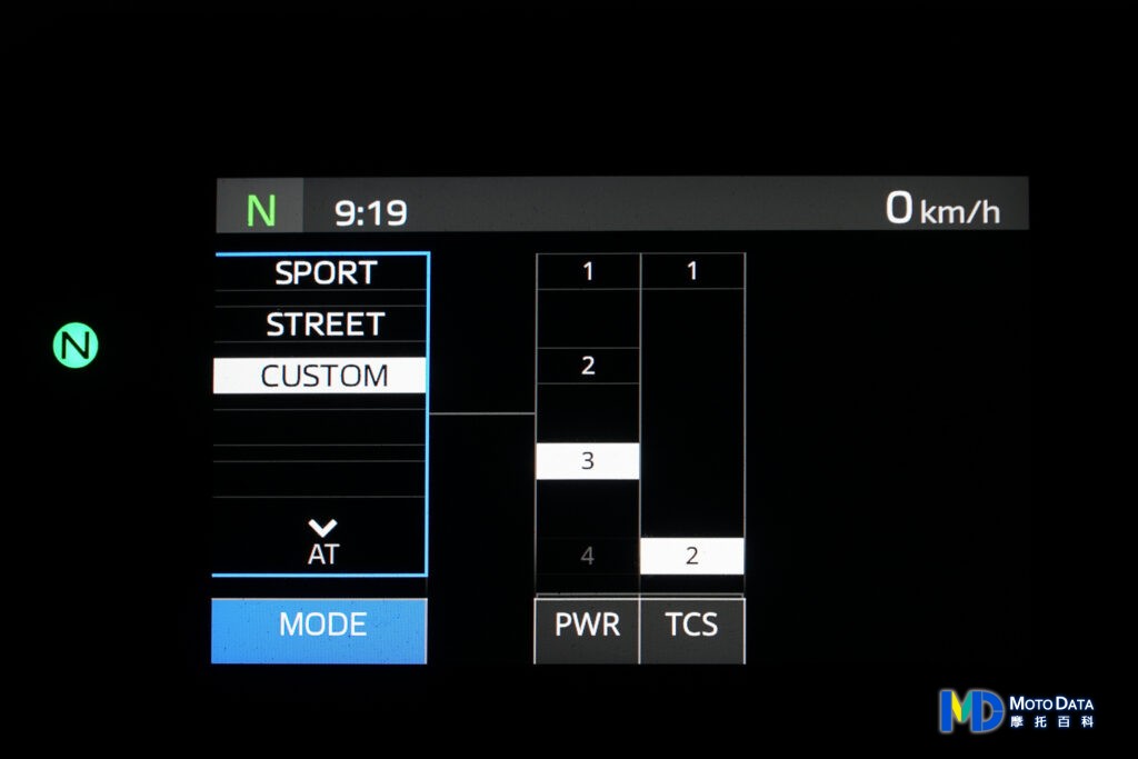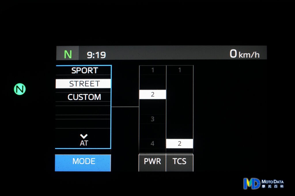 加入 YCC-T 之後,MT-07 提供更精準的節流閥控制之外,也帶來更有趣的騎乘模式可調機能,透過右把手上的 MODE 鍵,MT-07 終於可以在三種不同的動力模式之間調整,對於都會通勤的路段來說,STREET 基本上就能夠應付大多數的騎乘需求,動力已經是屬於隨傳隨到的等級,轉動油門後引擎轉速的上升容易掌握,同時此模式下的 TCS 循跡防滑系統預設也提供更多的輔助,安全性十足,樂趣則是留在 SPORT 模式之下。
