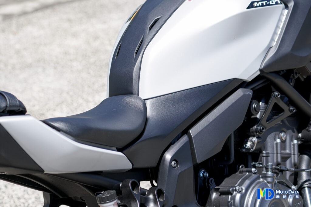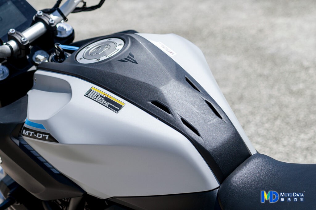第四代 MT-07 的油箱設計更為流線且調整過夾持的造型,不像是過往三代更注重於造型的發揮,有趣的是變得流線的同時寬度卻增加了 5mm,這次四代 MT-07 將油箱容量設定一樣是 14 公升,MT 手排版本油耗也有 24.9 公升,油箱前端一樣有著 MT 系列的雙層設計,層板上也有 YAMAHA 的標誌,前端也還是有類似進氣口造型,與之前的 MT-07 有家族性的延續感,至於油箱殼體則是塑料油箱罩,上方黑色飾條擁有 MT 標誌,並且標誌下方特別設計聲學傳導孔,能讓引擎中高轉時的進氣聲從這邊傳出,提供更多的騎乘樂趣,鑰匙也改到油箱前方,一樣有晶片防盜機能。