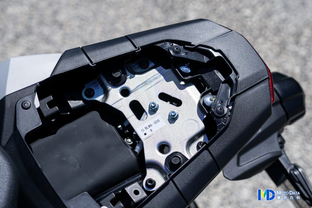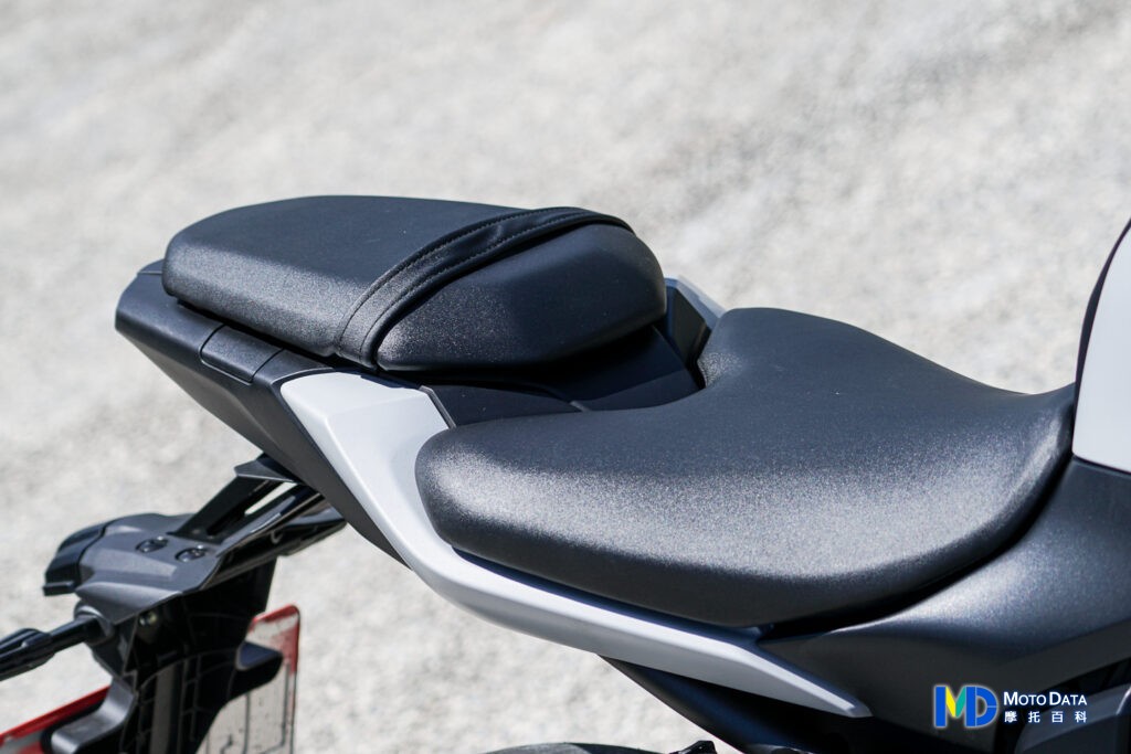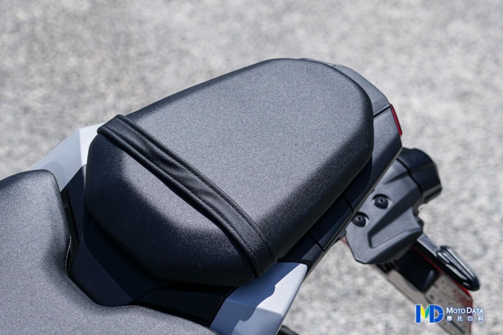 805mm 的前座坐墊高度,看數據來說會覺得很高,可是這次透過車台的調整與車殼的調整,整個前端寬度縮減 25mm,讓整個前座的腿內間距改變,173cm 的騎士都能夠幾乎雙腳平踏,168cm 的女性騎士也不覺得騎乘時會有壓力,另外坐墊的泡棉乘坐時感覺很像使用記憶泡棉的感覺,提升整個乘坐舒適度,後座採用分離設計,下方預設有簡易維修工具包,並且還有小置物空間,可容納行車記錄器主機等。