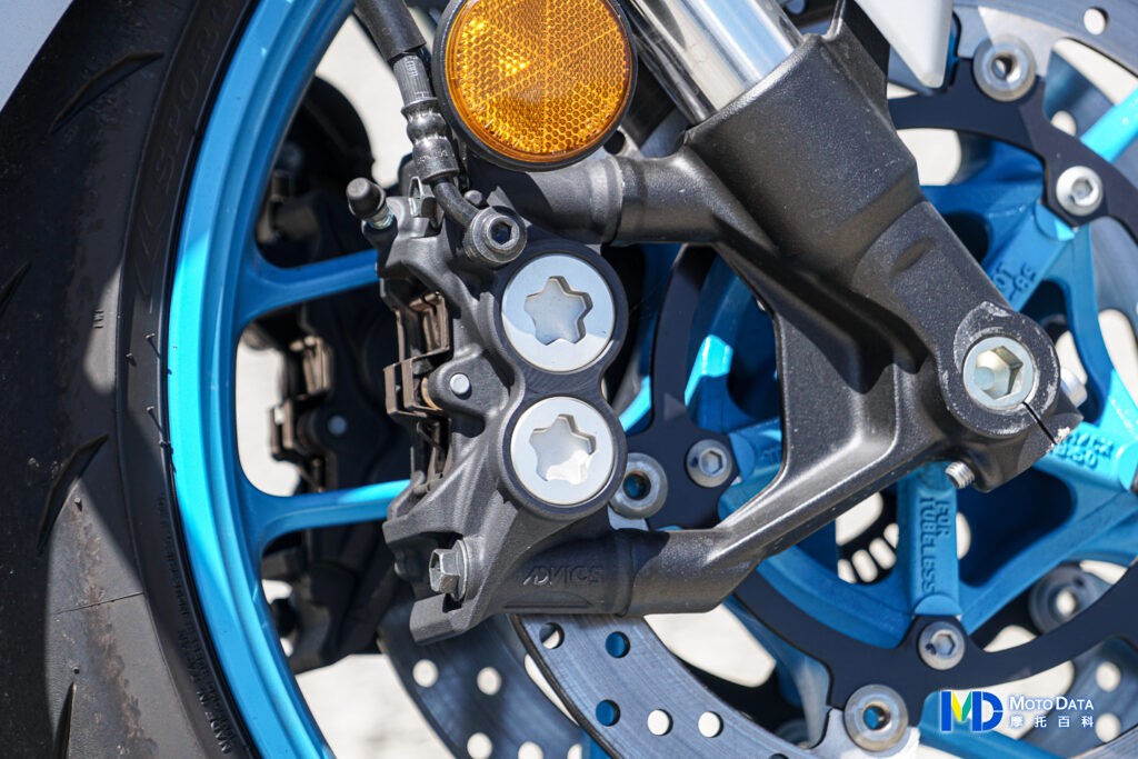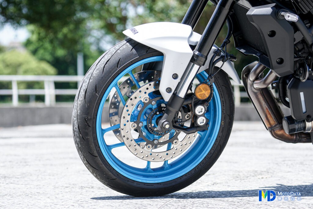 至於車輛的制動性能,在這次升級成倒立潛望式前叉後,MT-07 也同步升級為與 MT-09 相同的輻射固定式對向四活塞卡鉗組,手感來得更清晰之外,煞車時的制動能力也表現得更好,比起過往的那組對四卡鉗來說,你會很明顯能感受到急煞車情境時,前輪能夠瞬間進入有效的煞車作用,反應時間更快更靈敏,當然 MT-07 一樣配有 ABS 防鎖死煞車系統,升級過後也一樣能帶來更快速的防鎖死煞車系統效果。