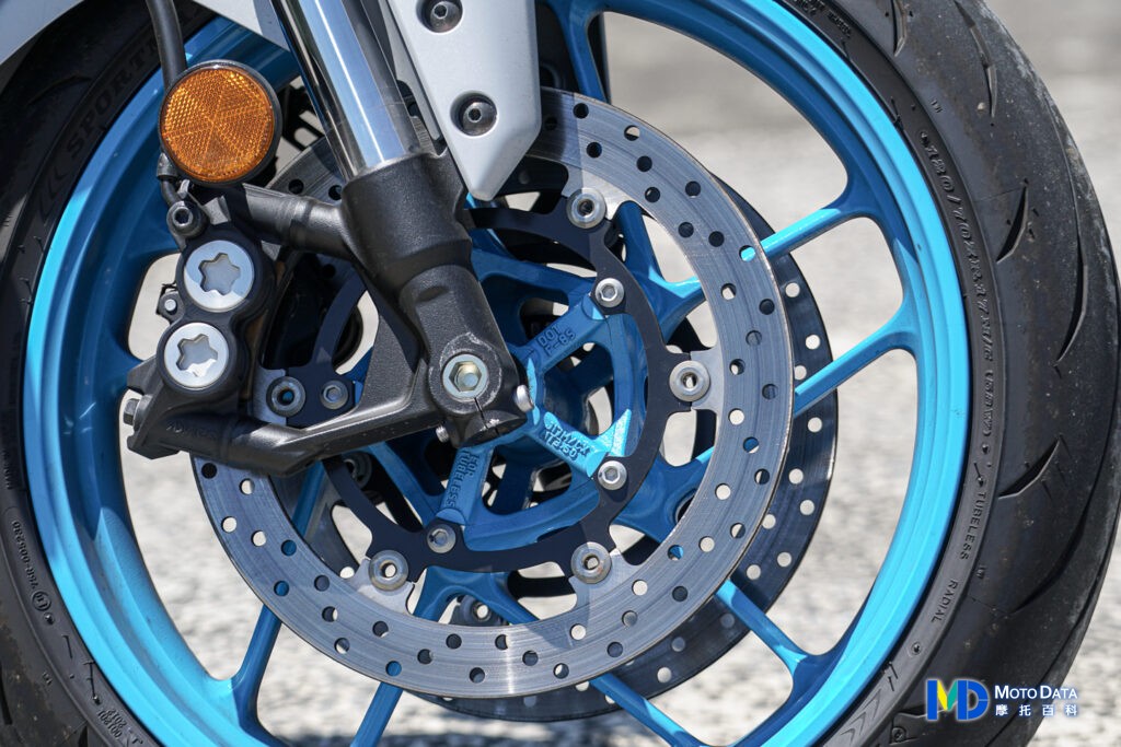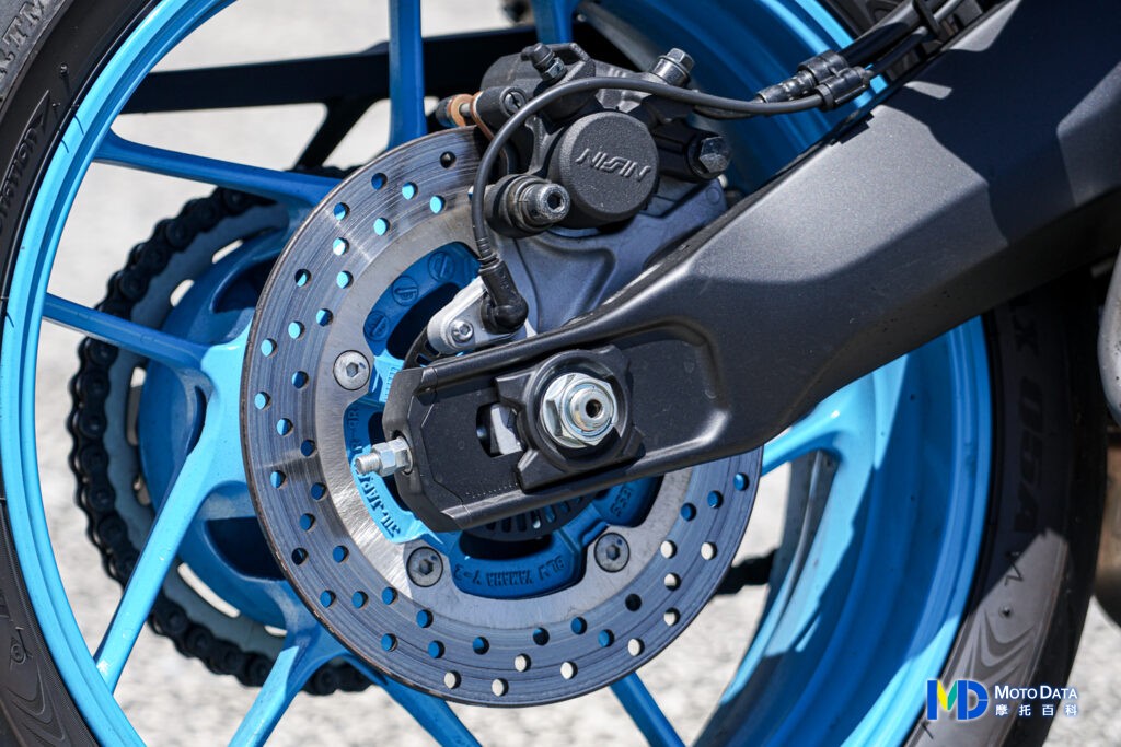 後輪制動系統為 NISSIN 的單向單活塞卡鉗,搭配 245mm 的固定式碟盤,並且一樣有 ABS 防鎖死煞車系統輔助,可避免急煞車時後輪鎖死。