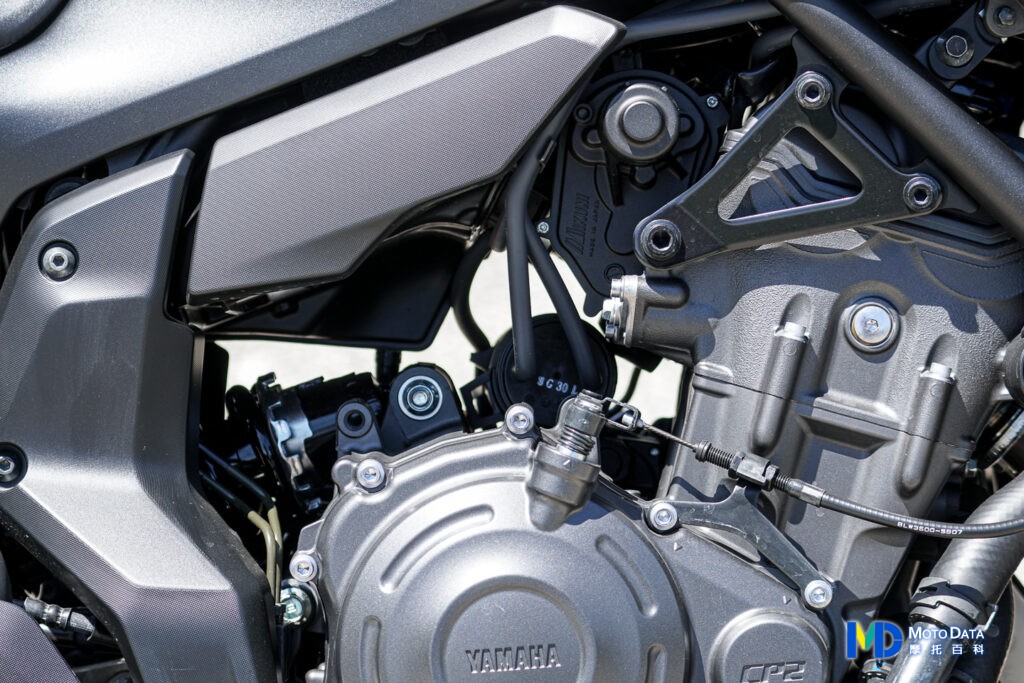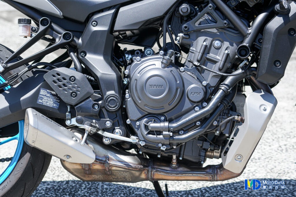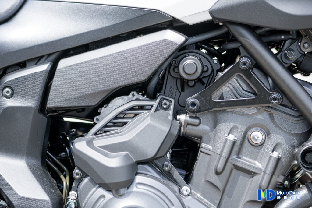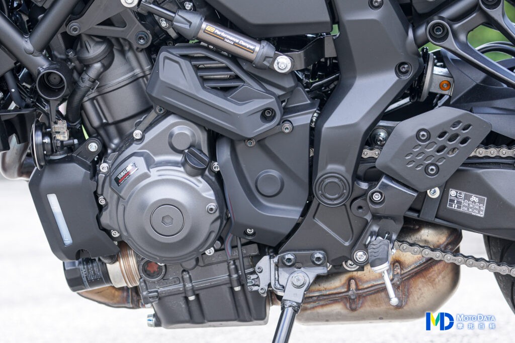 引擎表現方面,2025 MT-07 引擎一樣是使用 YAMAHA 的 CP2 並列雙汽缸十字曲軸水冷引擎,排氣量為 689c.c.,輸出最大馬力有 73.4hp @ 8,750rpm,最大扭力則有 6.9kgf-m @ 6,500rpm,扭力較上一代提升一點點,回到原有的 MT-07 水準,但更重要的是採用 YCC-T 之後,可以在引擎汽缸頭旁看到 Mikuni 製造的電子節流閥體,也因為四代的 MT-07 車台小修改以及節流閥改為電子節流閥的關係,引擎後方讓出巨大的空間給 Y-AMT 的機構安裝,同時這次引擎內也升級了輔助滑動式離合器,還有改變一至三檔齒輪的內齒齒數,並調整四至六檔的外齒加入導角,提升換檔的順暢與舒適度。