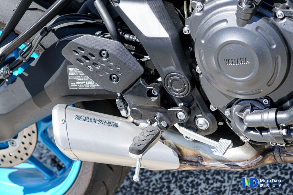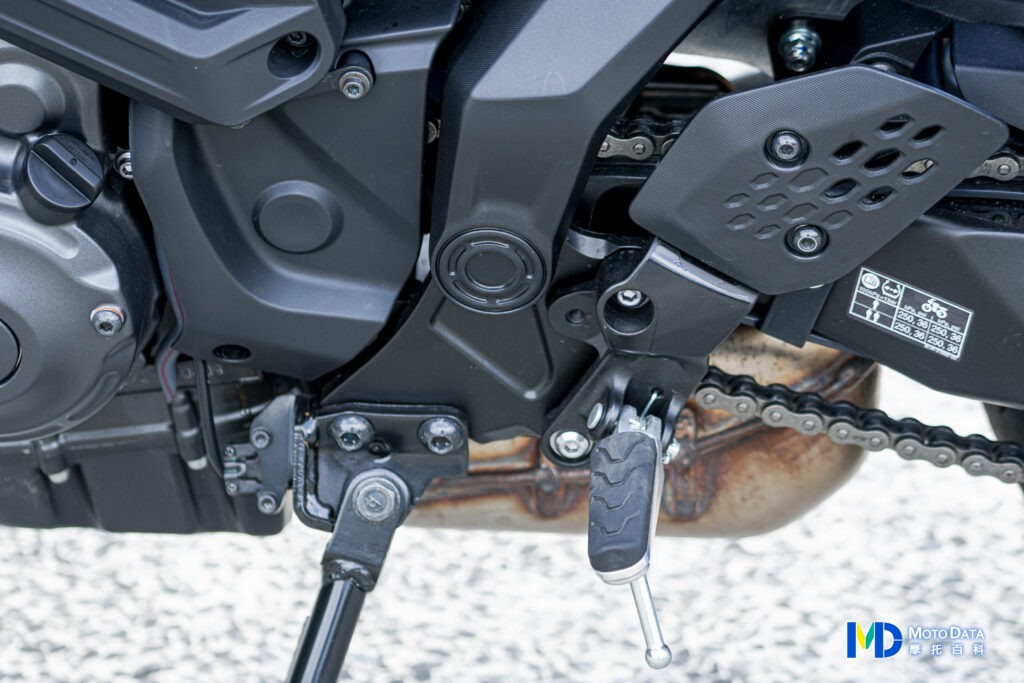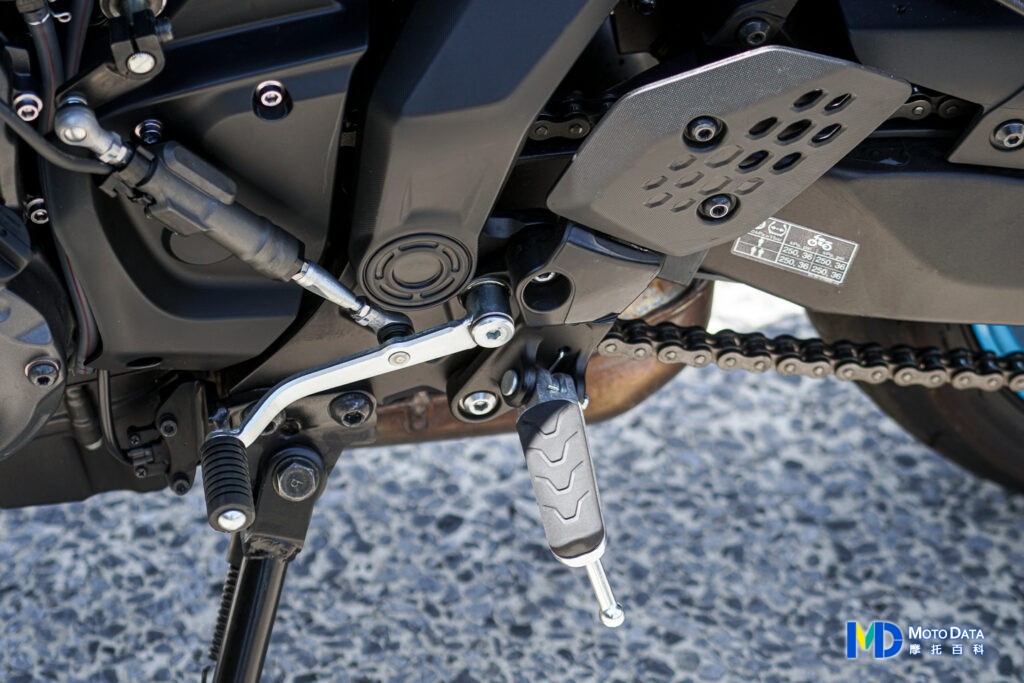 腳踏的款式有稍微改變,比起之前的第三代車型來說,第四代 MT-07 在腳踏的位置降低了 10mm,藉此提升舒適度,腳踏桿本身有橡膠防滑墊,左腳打檔桿前方,本次試乘的車輛有安裝選配的第三代 QSS 快排系統,透過搭配第四代 MT-07 的電子節流閥,MT-07 不僅擁有快排,還首次可選配進退快排系統,只要在原廠安裝完成之後,儀錶板內就可以看到 QS 的字樣,進退快排的準度也算準確,是非常推薦的選配項目,另外後座腳踏一樣維持手動收折的鋁合金款式。