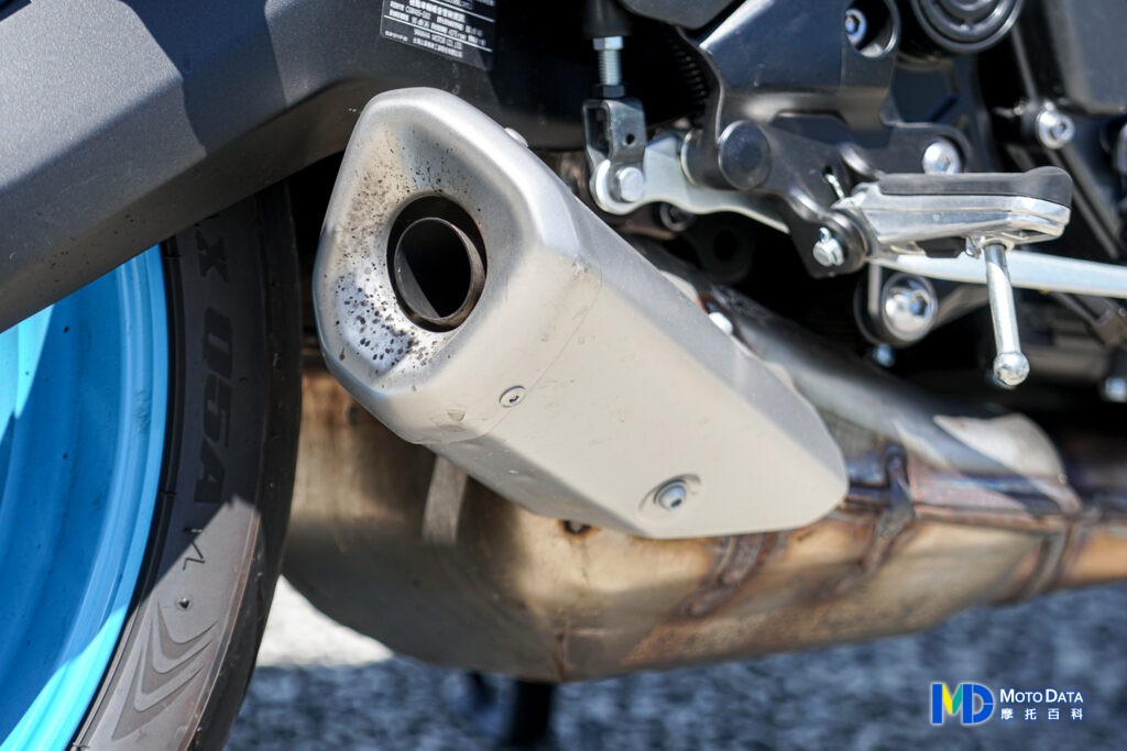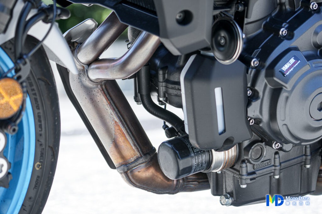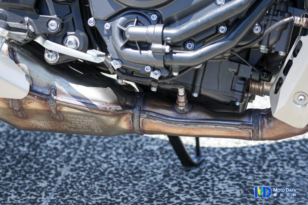 排氣管基本造型與三代的 MT-07 相似,一樣是從頭段就先匯入的 2-1 連接結構,接著單管進入俗稱便當盒的觸媒與消音室,最後再由右側下方延伸一小截出來,不過值得注意的是為了對應歐盟新的環保法規,第四代 MT-07 在頭段本來就有含氧感知器的情況下,又於第一階觸媒後新增第二含氧感知器,更換排氣管時需注意這兩個含氧感知器都要在,否則電腦就會顯示錯誤資訊。