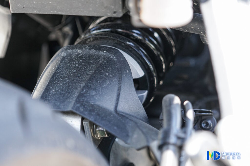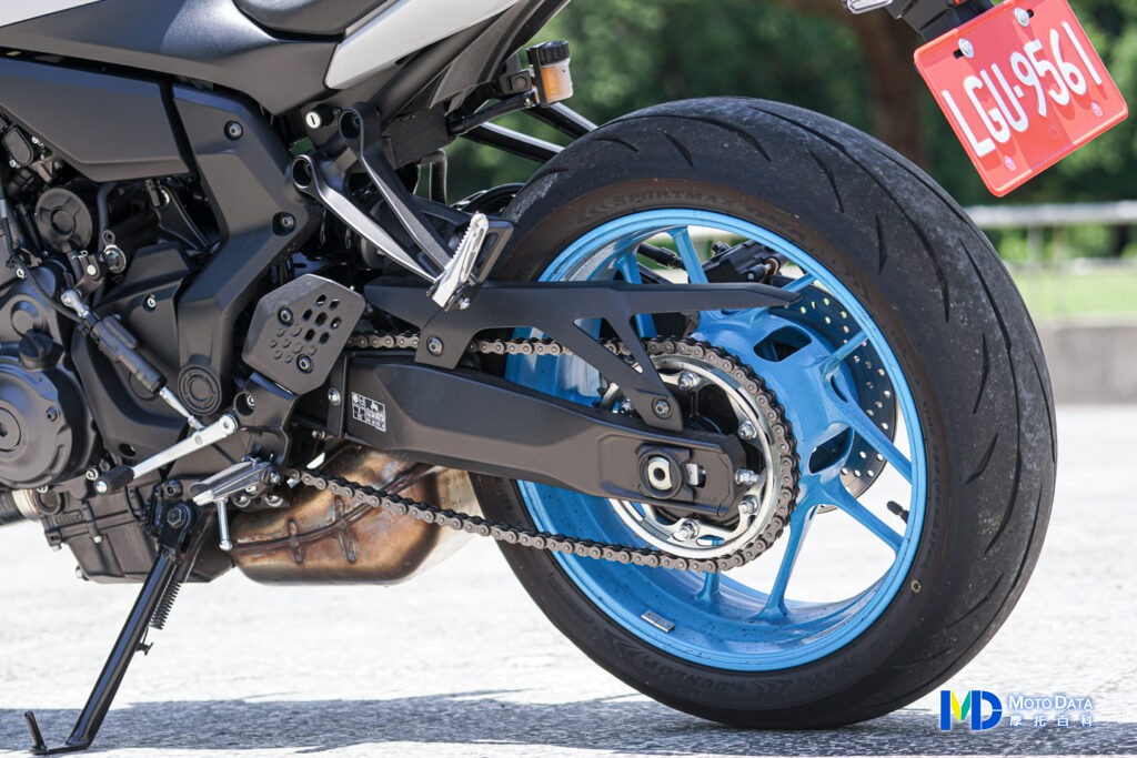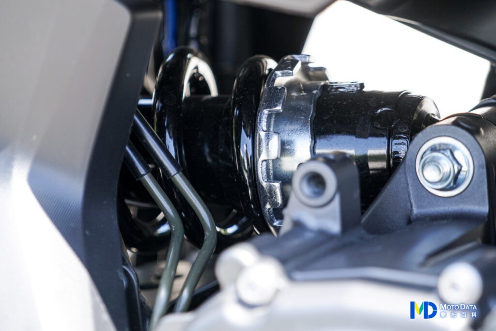 後輪懸吊系統為單槍中置直接連結的水平避震器,避震器前座直接鎖在引擎上,後座則是鎖在搖臂上,中間並無多連桿機制,屬於調整較為直接且路感更為清晰的後避震器總成,並配有預載調整,有趣的是過往隨車工具中會有很多配件,但這次第四代 MT-07 的隨車工具,也精簡到僅有避震器調整工具。