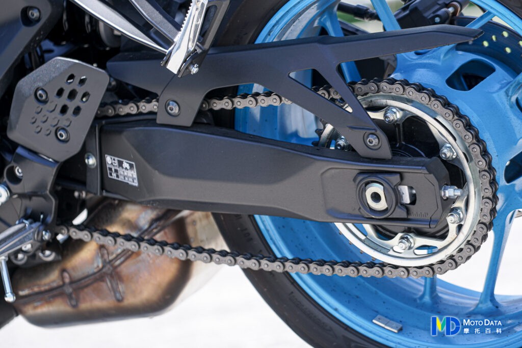 後輪搖臂為新造型的鋼製不對稱雙搖臂組,搭配後輪一樣是使用旋壓鍛造的 17 吋鋁框,後輪框重量也從原本壓鑄鋁框的 5,010g 降低至 4,940g,並且一樣提升了整體輪框強度,當然後輪還是使用鏈條傳動,易於維護且保養費用較為低廉。