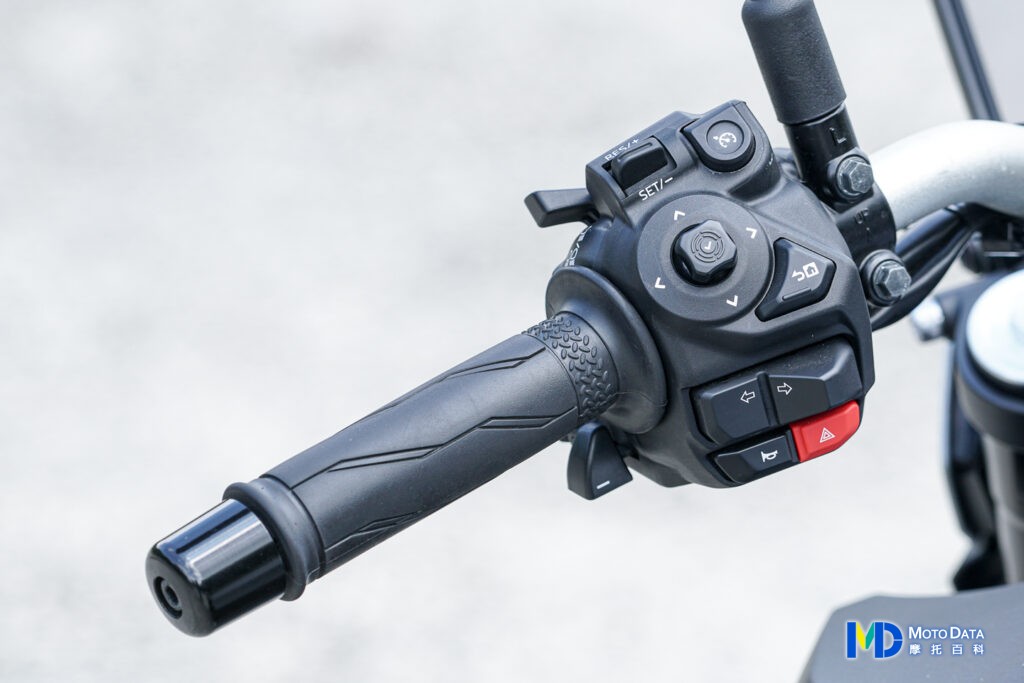 Y-AMT 版本的 MT-07 在騎乘視角上多了一點東西,左把手上新增用於定速系統的調整按鈕,定速可在三至六檔、40km/h~180km/h 內啟用,左把手前端還有用於 Y-AMT 進退檔的推按開關組,左大拇指可觸及的 – 鍵與前端的 + 鍵是連動的,所以如果手指不長的騎士,也可以選擇把 + 鍵往車頭方向推,一樣是可觸發 – 鍵的降檔功能,右把手上則是多了 AT/MT 自排與手排的切換鍵,MT-07 Y-AMT 總共提供五種動力模式,三種屬於 MT 模式,兩種屬於 AT 模式,要在這五種切換,需要先注意換檔模式為 AT 或者 MT,才可再進行該模式下的切換效果。