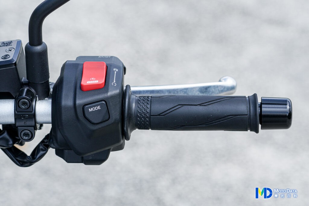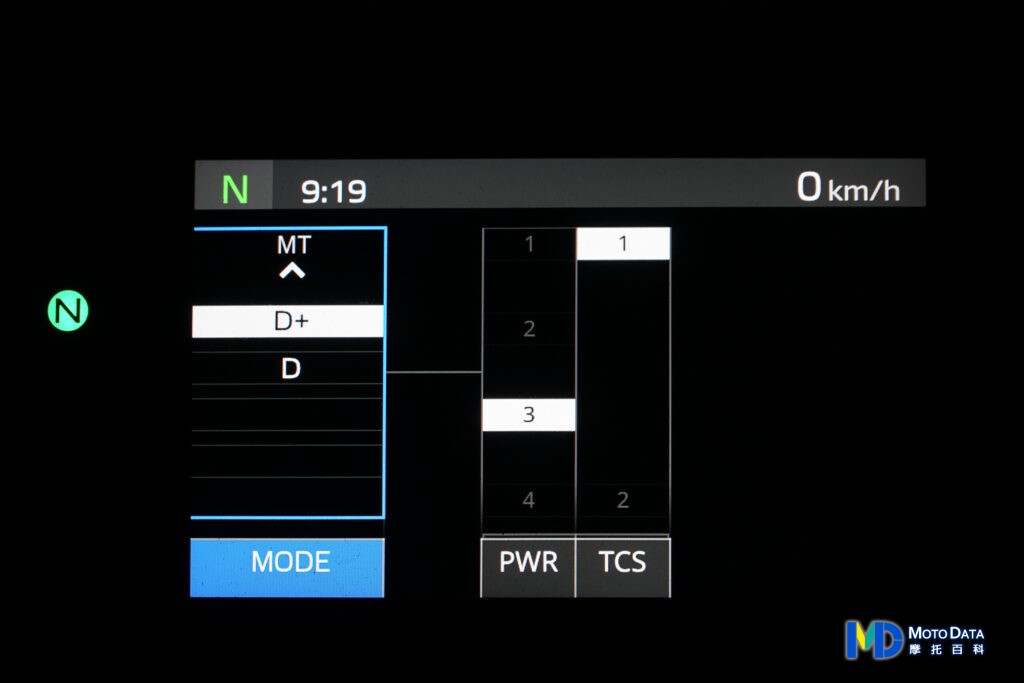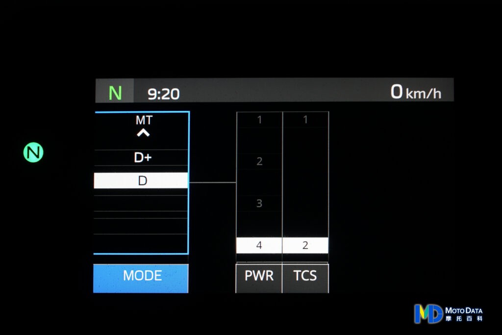 這個 AT / MT 的切換,是要透過右邊把手前端的扳機式開關進行,先切換至對應的換檔方式後,才能切換後續的騎乘模式,而 MT-07 Y-AMT 提供五種騎乘模式,分別是原本標準版 MT-07 就有的 SPORT、STREET 以及 CUSTOM 模式於 MT 換檔方式之下,還有新增 AT 換檔模式下的 D+ 以及 D,前三種基本上功能都與標準版相同,只是換檔的位置從左腳變成左手指,至於新增的 POWER 4 模式,則是相較於 D+ 所使用的 POWER 3 在動力輸出方面相同,僅有換檔邏輯的差異,D+ 預設的 POWER 3 換檔較為激進,轉速較高,D 預設的 POWER 4 換檔較為平順,轉速較低,所以換句話說,想要享受到這顆引擎帶來的完整動力,必須在 MT 下才能辦到,AT 下不論是 D+ 或者 D 都無法選擇至 POWER 1 動力曲線。
