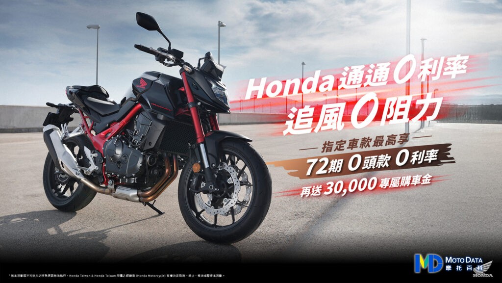 Honda Taiwan 秉持 「The Power of Dreams – How we move you.」 的品牌精神,致力於提供卓越的產品與服務,讓每一位騎士都能在多樣化的產品線中,找到專屬於自己的騎乘樂趣,於11月推出多項購車優惠專案,無論是帥氣有型STREET車系到壯闊冒險的ADVENTURE車系,指定車款,皆可享48期的零利率優惠,以最輕鬆的方式,即刻跨上心儀的Honda夢想車款,享受暢快的騎乘樂趣。同時針對搭載全新科技的CB650R E-Clutch、CBR650R E-Clutch以及經典美式巡航Rebel車系,更推出限時加碼好禮。