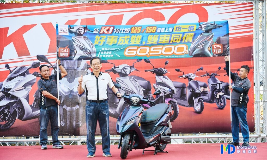 「新 K1 125/150 特仕版」展現KYMCO「好事成雙、大升級、大滿配」特仕版設計理念,125/150系列同步搭載「LED大燈與全液晶螢幕雙科技、雙避震(後)、雙碟煞(前後)、雙1級省油、雙帽大空間、雙置物掛勾」頂規配備,不僅超越競爭對手,重新定義大眾通用型車款的新級距,劍指125、150市場,目標勝者全拿,積極搶市。KYMCO 光陽集團董事長柯俊斌在眾人期待下正式宣布「新K1特仕版 125/150雙車同價最低60,500」限時優惠即日開跑,消費者可以開始向光陽全台通路訂購,「新K1特仕版」也正式量產。