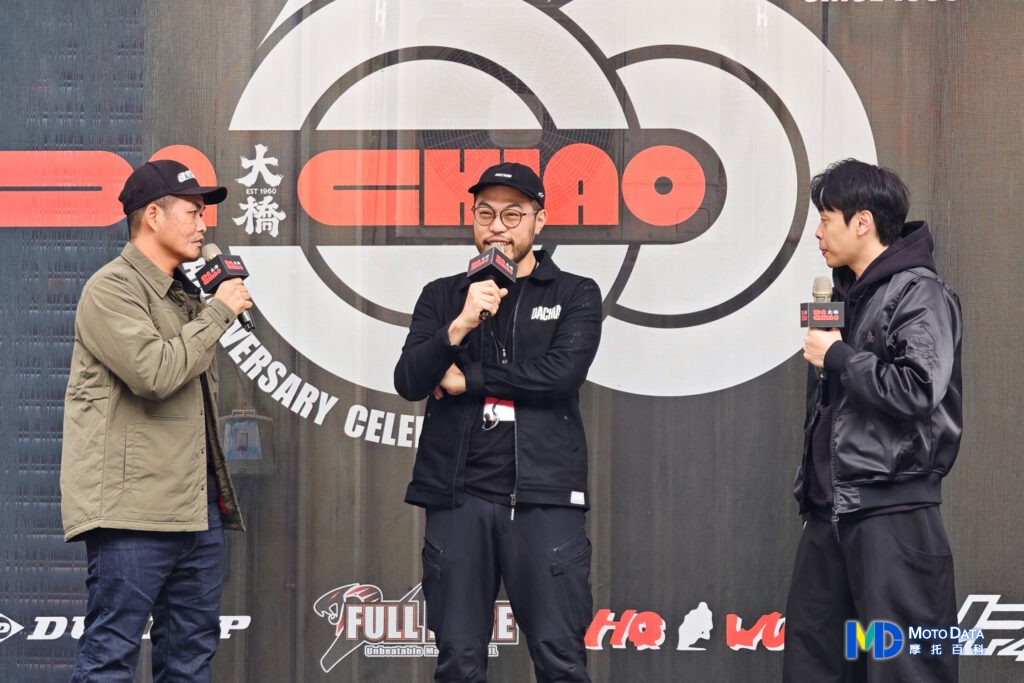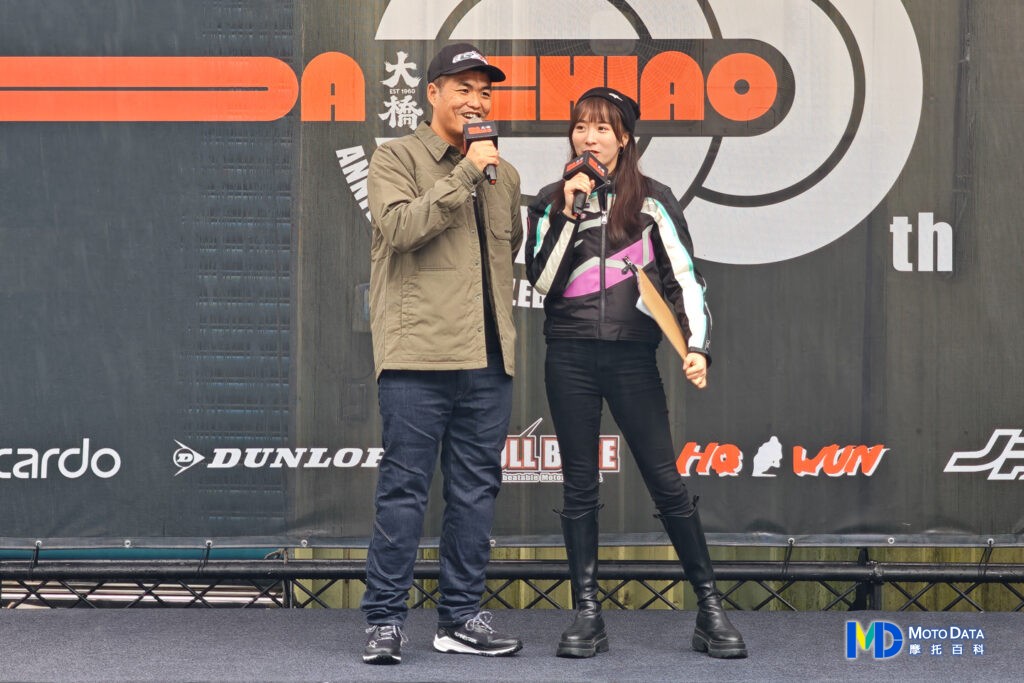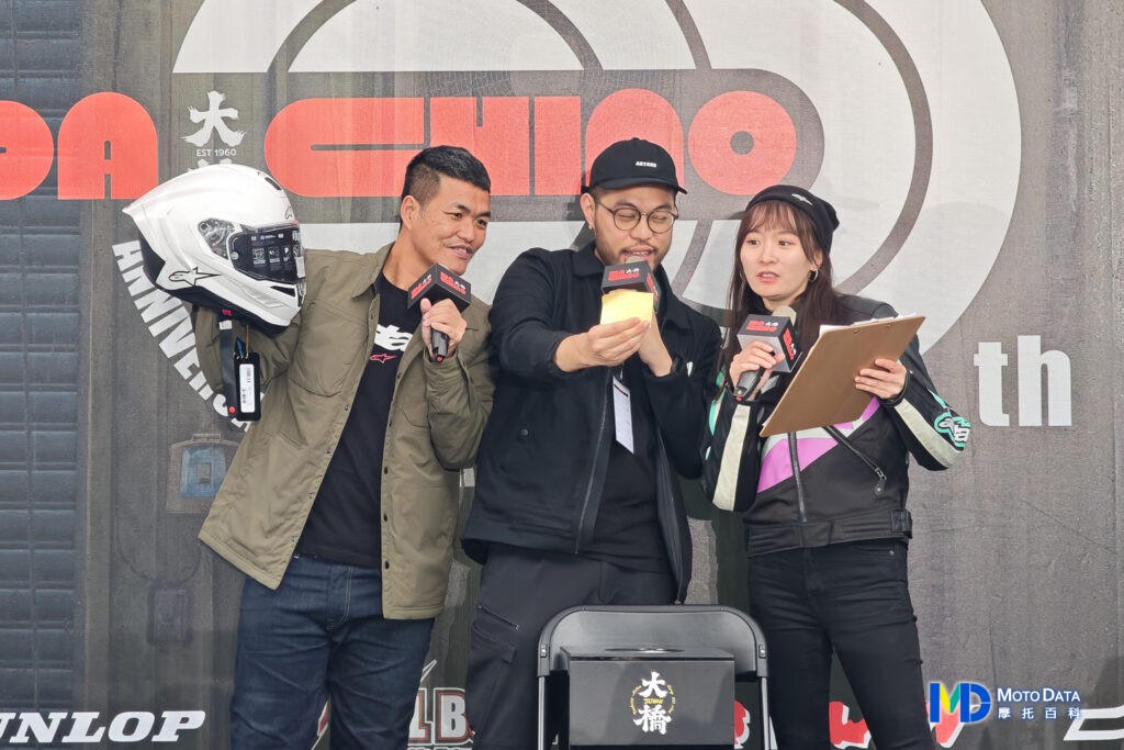 今日園遊會的活動主持人,則是請到大家非常熟悉的 Bike in 機車資訊網主編小三,以及與 DAZN 電視台合作節目「速度世界」的主持人 Ivy,兩位的互動讓現場車友們感到有趣之外,同時也請到大橋的第三代 Mike 謝岷皓上台致詞,由 Mike 與大家分享大橋這 65 年來的歷史與進化,以及為什麼想要舉辦這場園遊會,這其中包含車友們的建議,希望能看到大橋獨立的活動等,小三一起分享年輕時曾經拿著雜誌型錄去找大橋訂購安全帽的趣事,另外也請到康康嘴機車的康康本人上台,與大家聊聊脫口秀的部分,康康也在這邊向大家正名,他是「康康」,不是「康康嘴」,請大家記得這部分。
