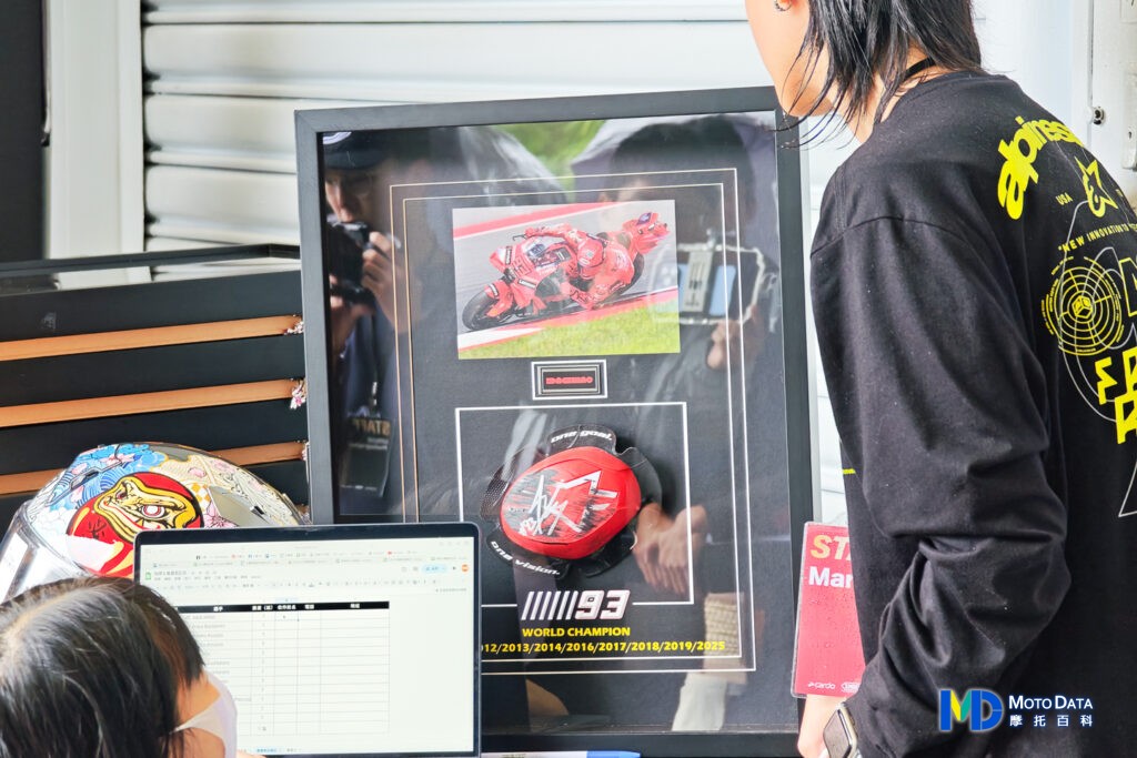 而來到中午時段,就是大家最期待的 MotoGP 選手簽名滑行塊與安全帽的義賣競標活動!由於 MotoGP 現在有高達 10 位的賽車手選用 Alpinestars 部品,因此在今年的場上,Alpinestars 以及大橋幫大家蒐集選手的實戰滑塊,並請選手簽名後,由大橋製作裱框,邀請大家一起進行義賣競標活動,這個競標不限定一定要大橋 VIP 才能參與,也因為今日下雨,所以有些車友們可能看到雨勢就決定在家發呆,這也讓現場車友們得標的機率大幅提高,若是比較知名的選手滑塊競標時,熱烈程度不亞於名畫標售現場呀!
