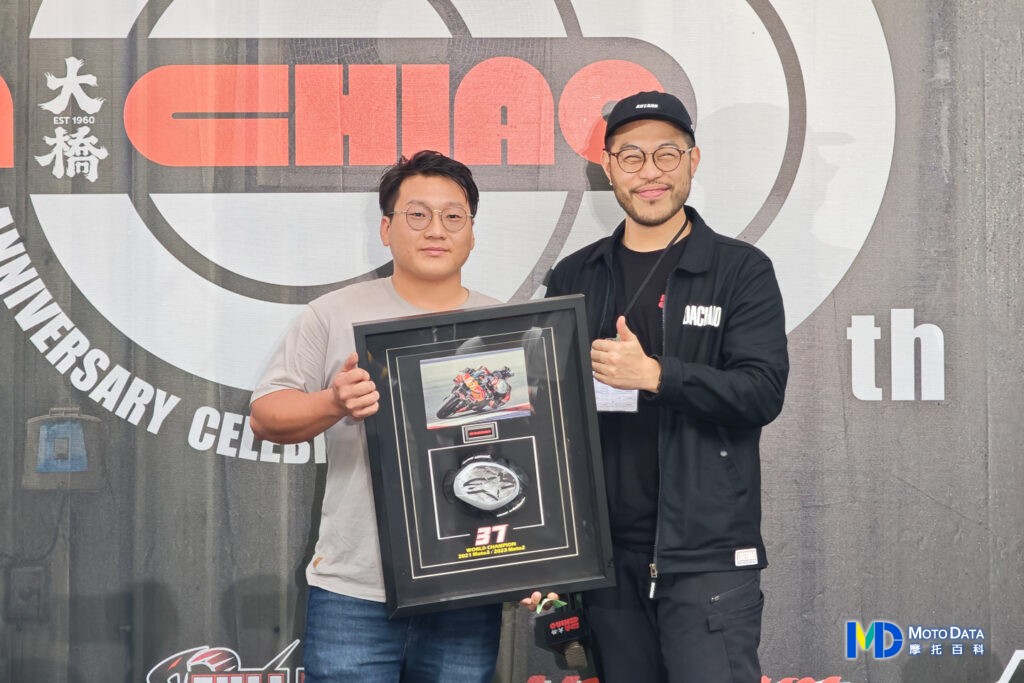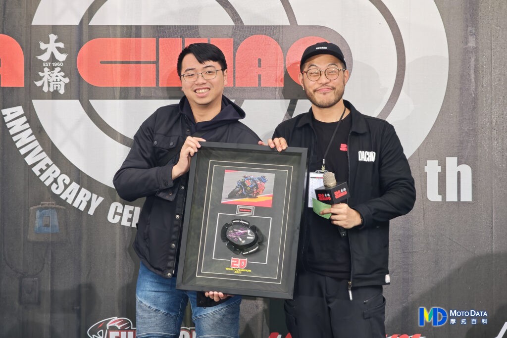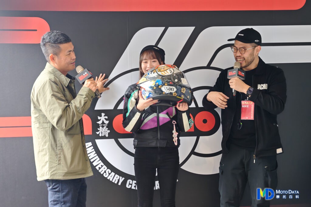 最後大獎,則是由大橋提供的 SHOEI X-FIFTEEN 全罩式安全帽一頂,這頂安全帽還有 Marc Márquez 的親筆簽名,因此一樣非常具有收藏意義,而為什麼挑選這個 MARQUEZ HOLI 彩繪,是因為 Marc Márquez 認為所有 X-FIFTEEN 的彩繪之中,他最喜愛這個配色,所以這頂安全帽可以說是 Marc Márquez 在自己最喜愛的帽子上留下簽名,不僅全球唯一,更是唯一由 Marc Márquez 認可的安全帽,最終恭喜這位車友奪得這項大獎,活動也在大獎結束後畫下完美句點。