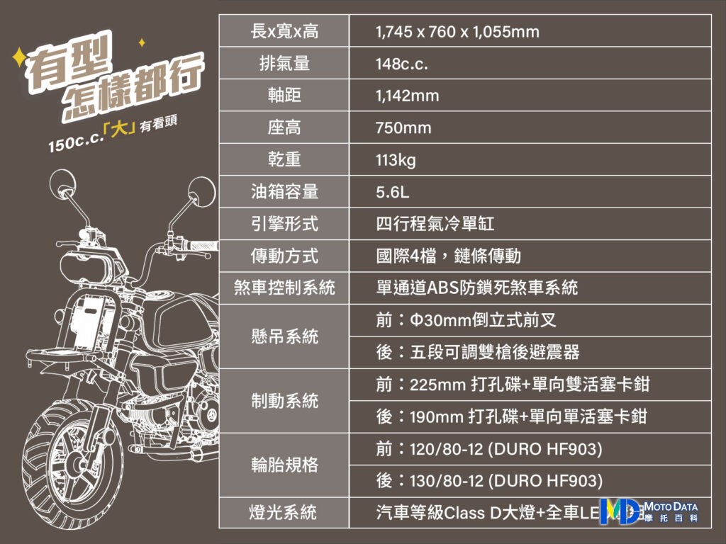 全方位冒險玩家MK150以精巧車身搭配僅 1,142mm的極短軸距,在市區穿梭、山區轉彎時更加俐落,750mm的低座高配置友善,讓騎士自信駕馭。車輛搭載倒立式前叉及五段可調雙槍後避震器,可依據載重和路況調整,無論通勤或輕度越野皆能確保良好舒適度。採用前後碟煞設計,前輪搭配單迴路ABS防鎖死煞車系統,在多變路況下提供可靠且線性的煞車表現,維持操控穩定性,提升行車安全。