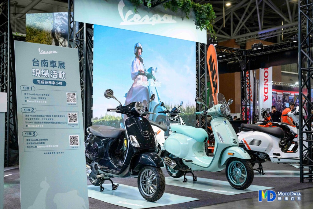 本次車展展現了 Vespa 品牌的完整車款家族魅力,包括:人氣入門小車 LX 125 火山黑、經典與時尚兼具的 Primavera S 150 薄荷綠、廣受台灣Vespa車迷喜愛的人氣車款 Sprint S 150 勁石灰,以及結合智慧科技與當代美學的 Sprint Tech 150 冰曜灰。旗艦黃牌亦同步展出:包含充滿剛毅運動靈魂的 GTS 300 Super Sport 與承襲經典傳奇跑旅精神的 GTV 300 雪地白,全方位滿足歲末新春換車族對風格與性能的極致追求。