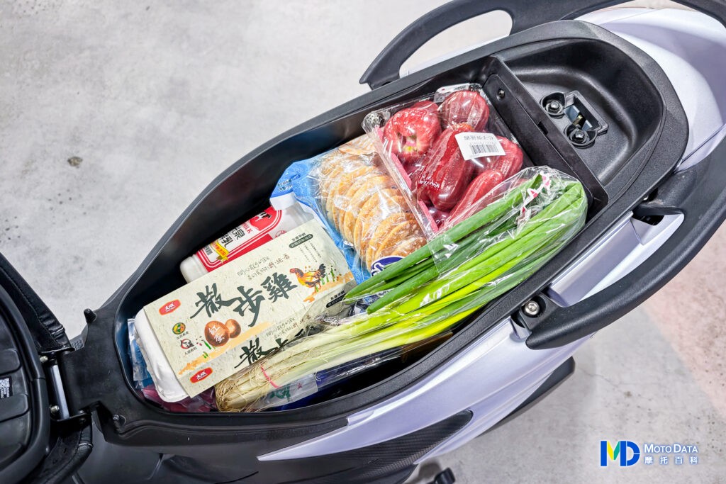 對於許多人來說,一輛機車可能就要承擔通勤、生活與旅遊的一切,好在 VIVO 活力 125 的車箱空間實用性高,貼近於全平面的車箱空間,加上寬裕的腳踏空間,對於平常去大賣場採購一週食材來說,VIVO 活力 125 的空間都算很好使用,可以看看我們示範中的車箱置物量,幾乎是把剛剛整車購買的零食、牛奶、雞蛋以及生鮮等都放入,彈性很高,而且腳踏空間放上大袋 24 入裝的抽取式衛生紙,也還保有許多置物空間。