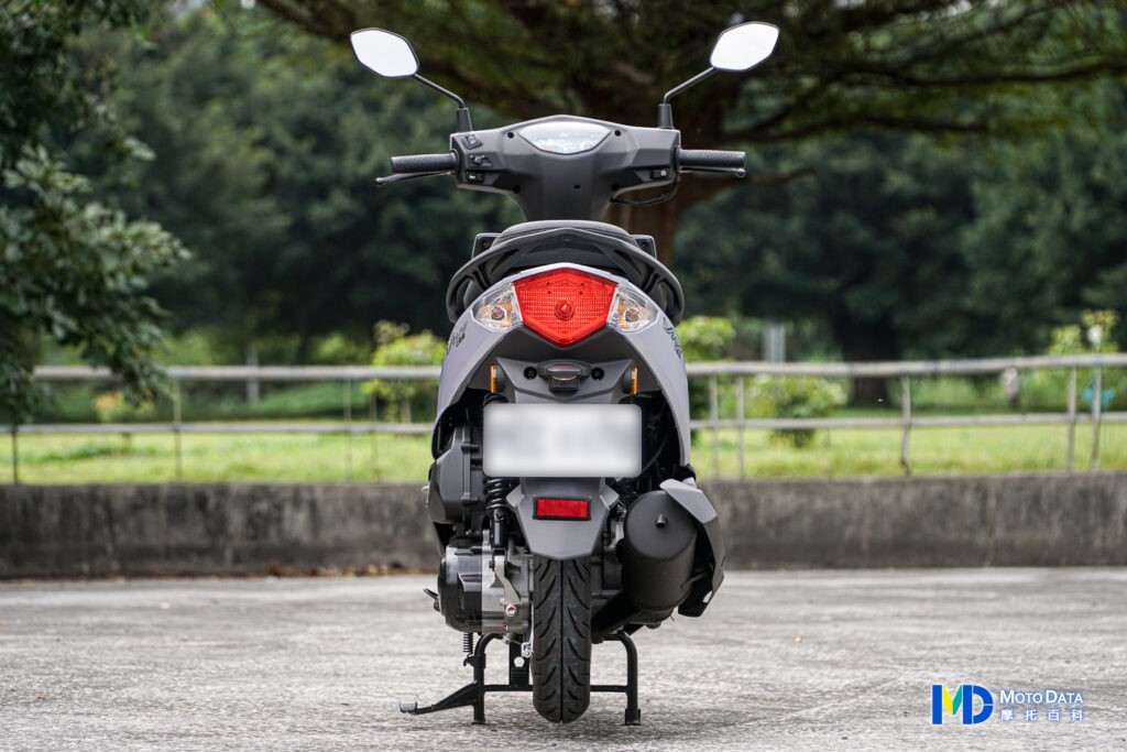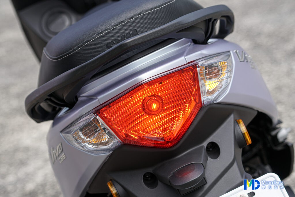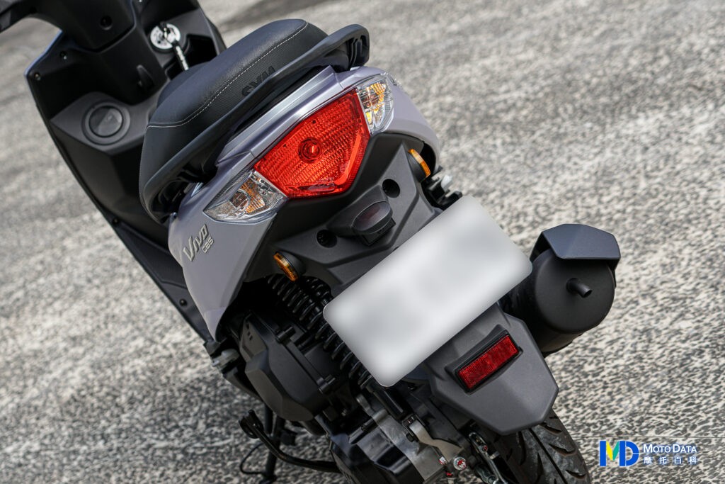 尾燈方面,VIVO 活力 125 的尾燈組均為鹵素燈組,中央為鹵素雙燈絲煞車燈,拉下後為第二燈絲點亮,兩側則是鹵素方向燈組,牌照架子中規中矩,上方設有獨立的鹵素牌照燈。