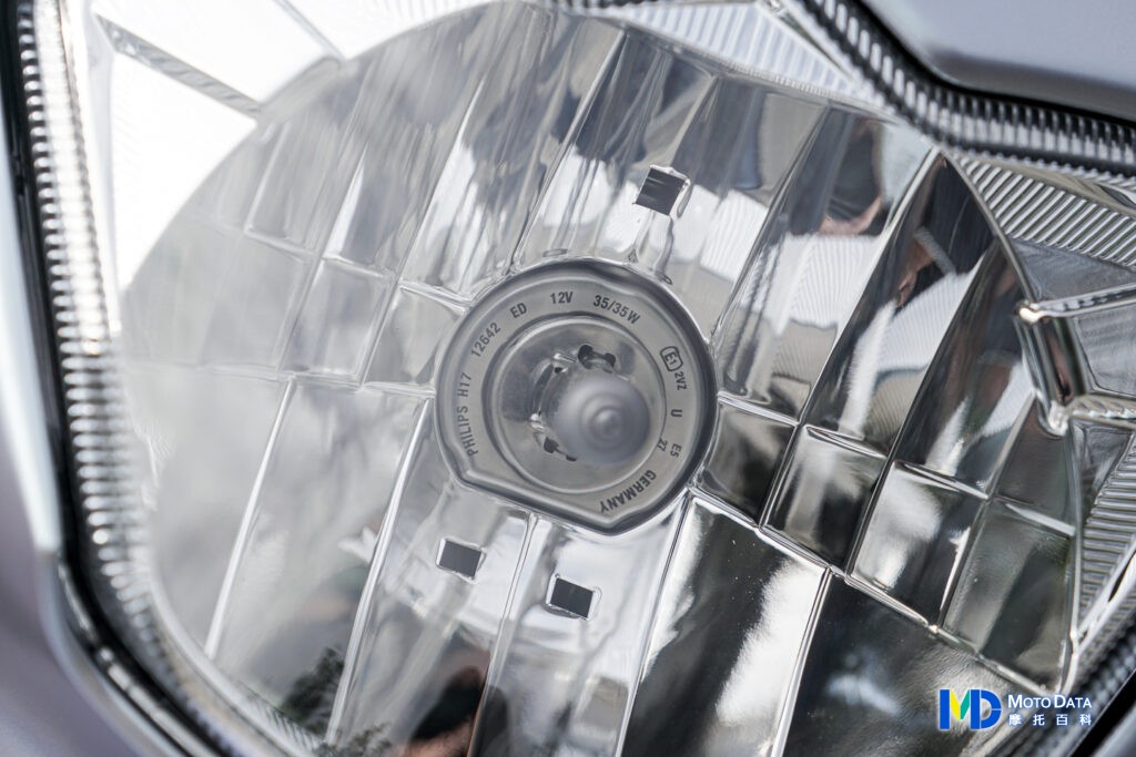 大燈燈型表現拍攝部分,透過固定好的曝光數據模擬出人眼現場觀察的情況,上圖可左右拖曳調整近燈與遠燈燈型比較;由於使用的是 PHILIPS 的 H17 鹵素燈泡,因此照明出來的發色是黃光為主,與近年常見的 LED 燈型有明顯差別,但其設計專為摩托車開發,照出來的近燈光型表現很適合都會通勤使用,能在車輛大約兩個車身前形成一區光團,寬度則約在兩個車道寬,遠燈則是延伸至更前方,並透過反射面維持剛剛近燈區域還有輔助照明,兼顧安全性。