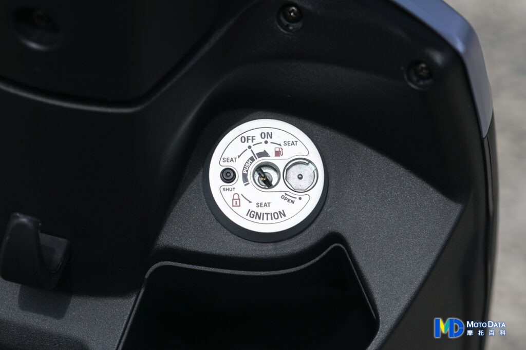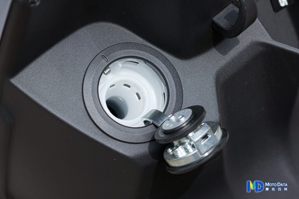 內裝空間機能也是屬於實用性為主的設計,可看到右邊為傳統鑰匙並且配有磁石防盜鎖蓋,下方杯架可放入手搖杯或者 800ml 的寶特瓶,中央置物掛勾是常駐且配備防跳脫的機能,內裝空間也為了掛勾下掛置物品有做內收,左邊則是彈出式油箱蓋,油箱容量為 5.5 公升,經濟部實測油耗是 59.1km/L,也就是說一桶油最少能跑 300km 免加油,以 109 年交通部公布的機車使用狀況調查摘要分析,每人平均一天騎乘是 12.9 公里,以 22 天的工作天計算,幾乎是一個月才要加一次油。
