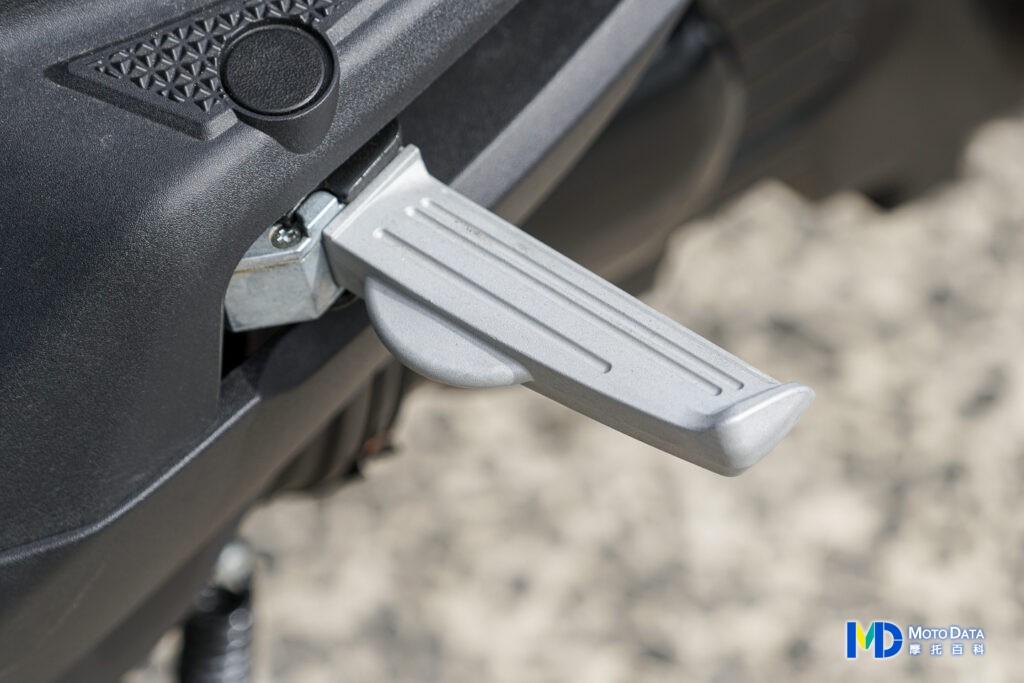 VIVO 活力 125 的腳踏空間有 260mm 長,且腳踏的止滑紋路非常多,前端還有斜踏區域,不論是對於行李箱擺放,或者是平常生活物資採購等,這樣的腳踏空間都有很不錯的實用性,而且就如我們前面試駕時實測,腳踏空間可以放入較厚的鋁框 20 吋行李箱,想要親子騎著 VIVO 活力 125 旅遊,或者是想要騎車前往大眾運輸來充實假期,這樣的腳踏都能辦到,後座則是使用飛旋踏板,在飛旋踏板的上方也有用於給孩童踩踏的腳踏區域。