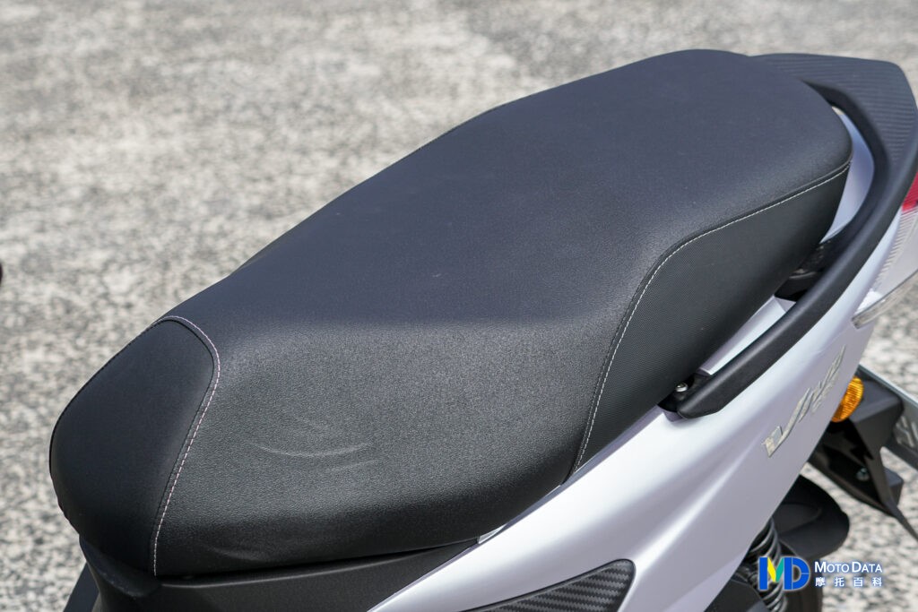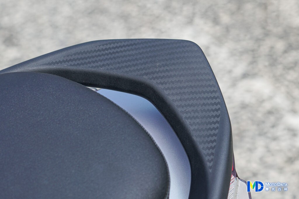 坐墊表現是 VIVO 活力 125 還不錯的部分,泡棉彈性適中,皮革接觸面摸起來有質感,縫線更刻意使用白色的縫線,讓坐墊看起來也不會過於單調,坐墊下置物空間有 25.6 公升,放入一頂 3/4 安全帽後,還能放入女性日常的手提包等物品,或者如前面示範,大賣場採買小家庭一週的日用品也不太有問題,而且 VIVO 活力 125 在車身上以及後扶手等,都有碳纖維壓花造型,儘管是以質感為主軸去打造的車型,但在這邊也多了些運動感。