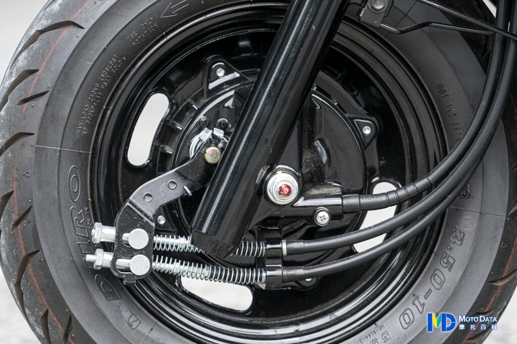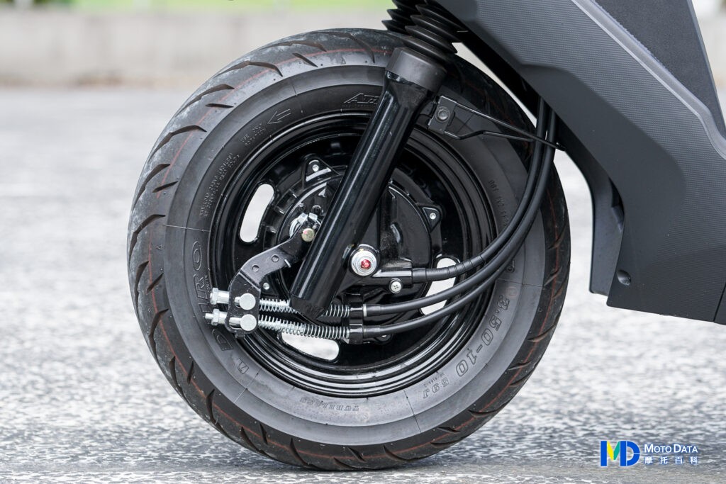 VIVO 活力 125 的前輪使用的是 10 吋輪胎組,搭配 31mm 的潛望正立式前輪懸吊組,阻尼以及彈簧設定都偏軟,可以提供比較舒適的騎乘路感,本次拍攝車型為前後鼓煞,所以在輪框的材質為鐵框材質,但一樣有經過黑色烤漆。