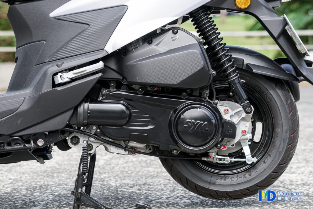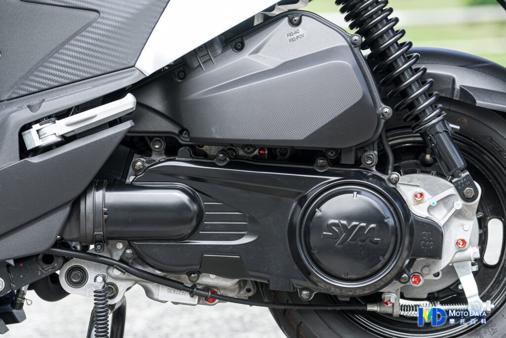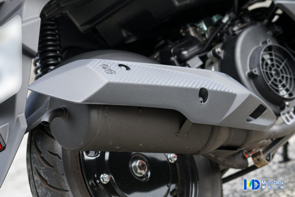 排氣管採用單一防燙蓋組,前段則是自引擎強制進氣風扇罩下方,額外鎖上防燙片,避免雨衣或者腳直接去碰到相對較燙的前段排氣管。