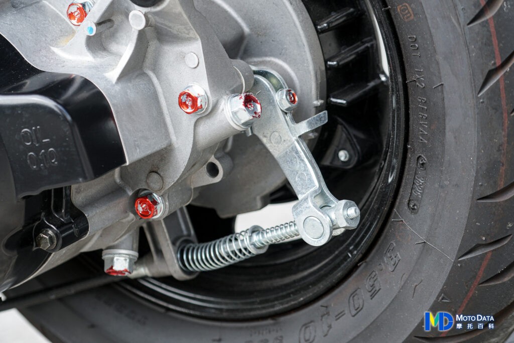 後輪也是使用鼓式煞車,這次在煞車連動臂上也有指引,標示煞車片磨耗程度,若調整至緊繃還是沒有煞車,則建議去車行進行煞車片更換。