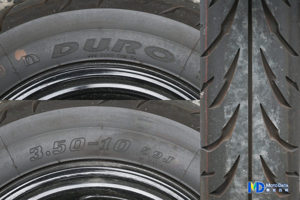 VIVO 活力 125 前輪配胎微 DURO 華豐的輪胎,型號是 HF-918A-3,規格為 3.50-10 59J,後輪一樣也是華豐輪胎,不過型號的最後一碼不同,型號改為 HF-918A-5,規格一樣是 3.50-10 59J,兩款輪胎的胎紋都可以參考右側,雖然最後一碼不同,但實際上胎紋是一致的。